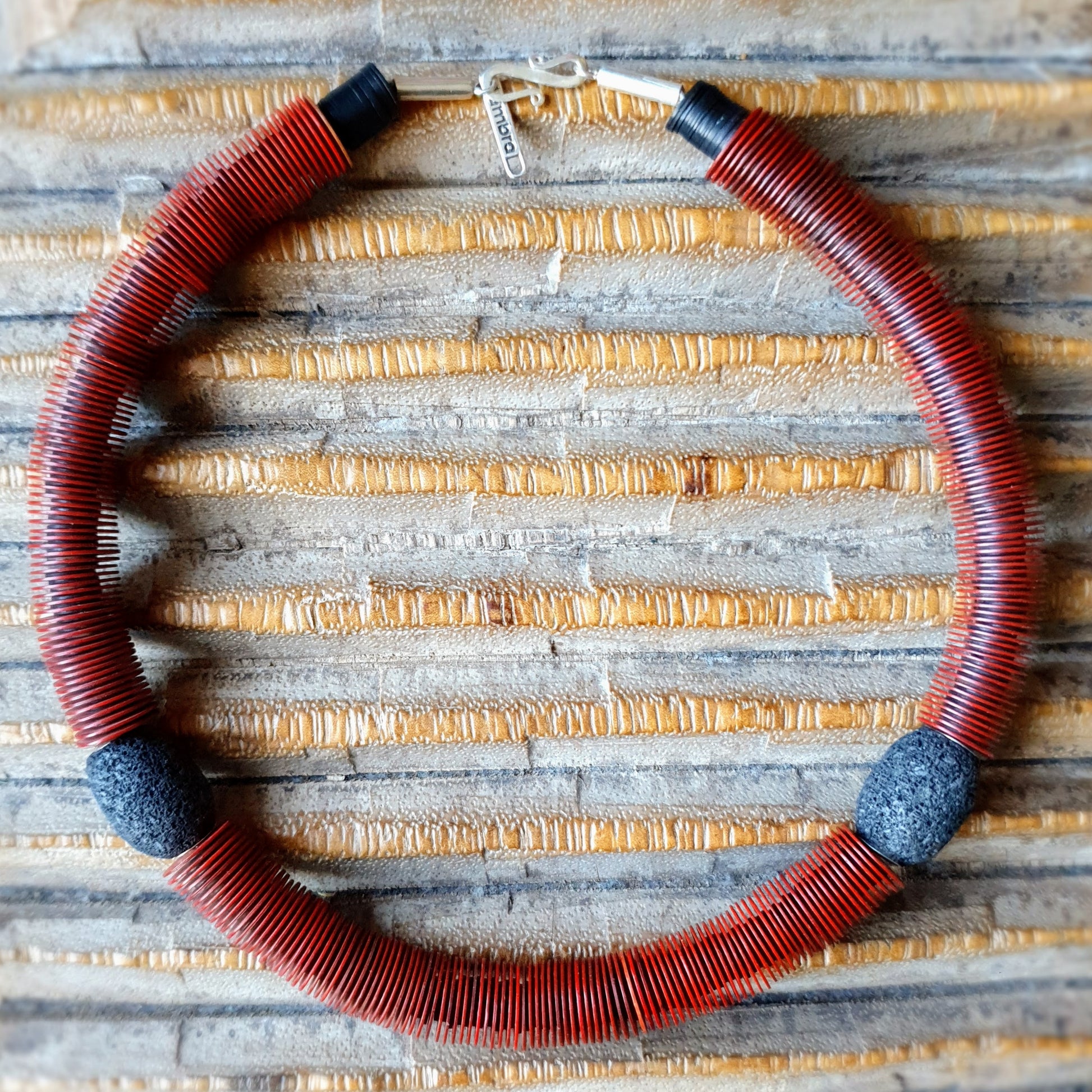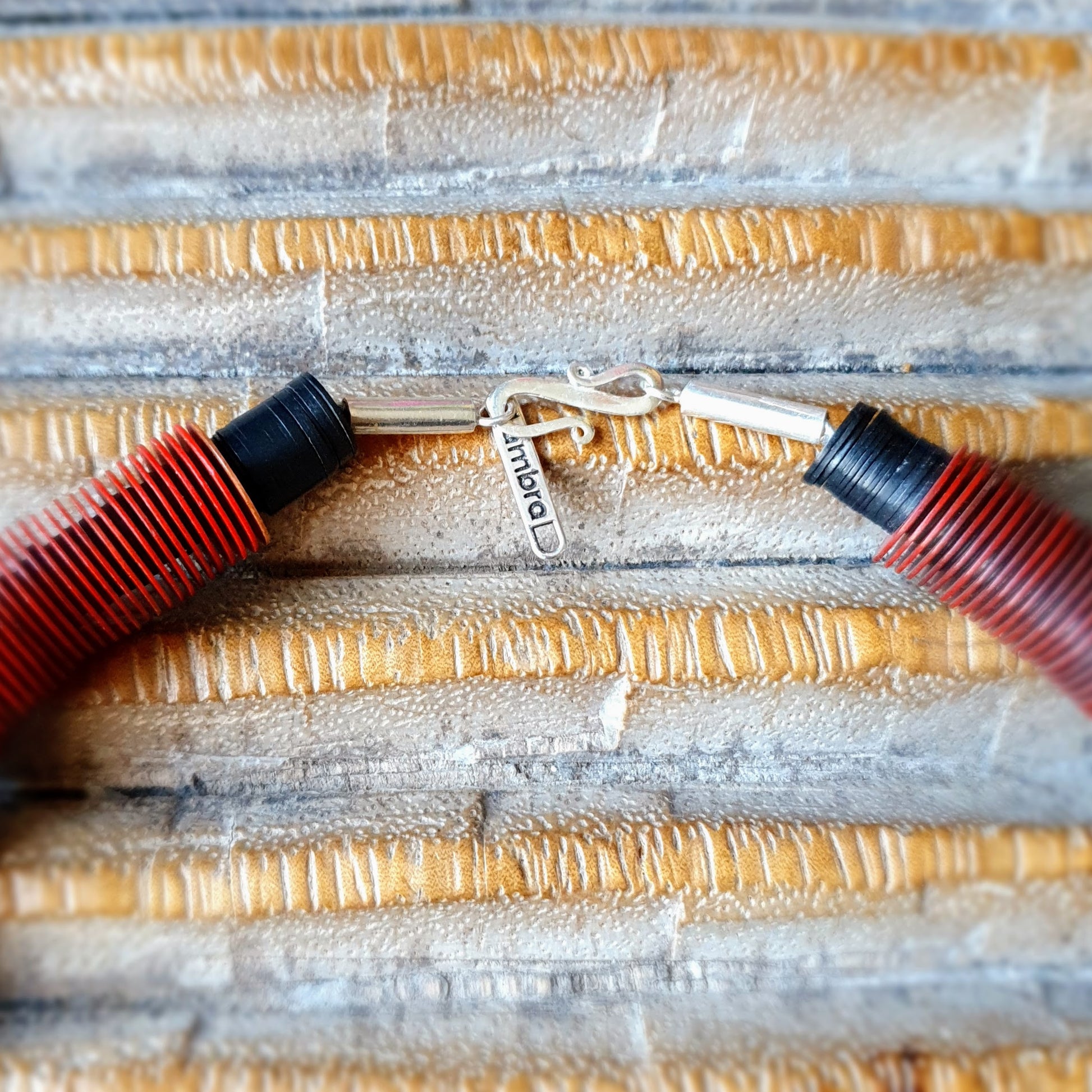 Moderne handgearbeitete Halskette mit schwarzen in Silber gefassten Lavasteinen und roten und schwarzen Bakelitscheiben aus Afrika mit Silberverschluss von ambra Schmuck.