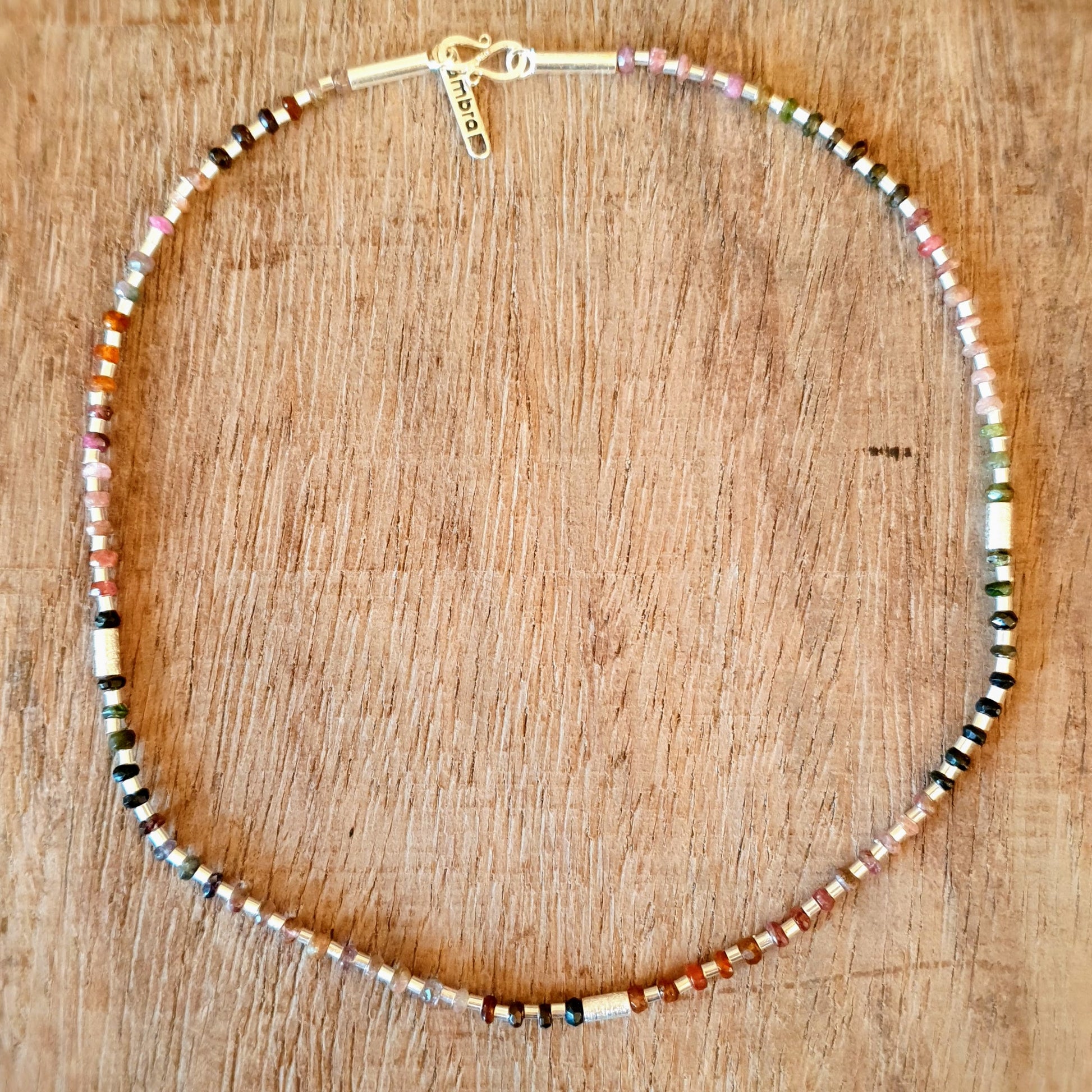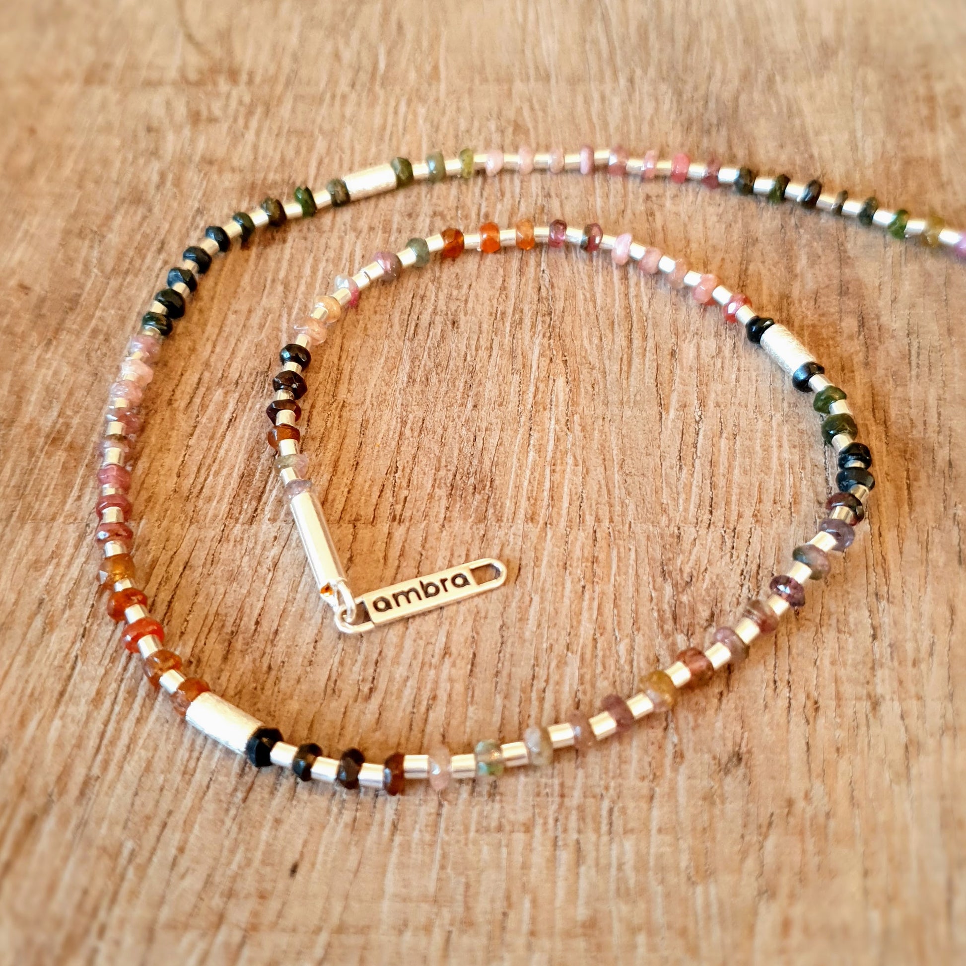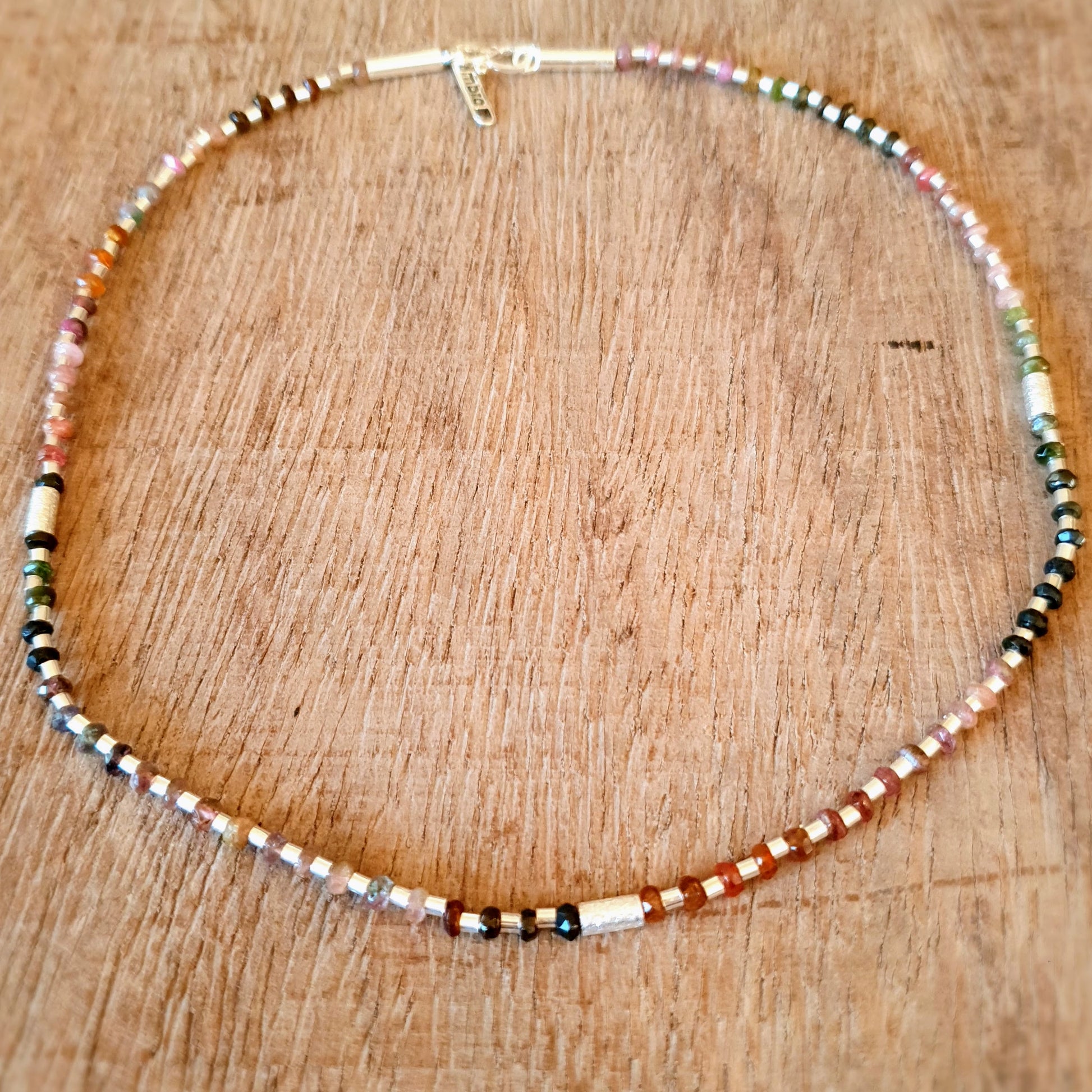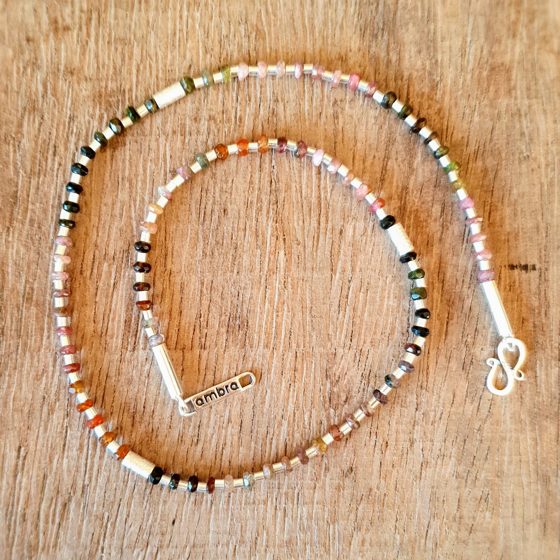 Feine handgearbeitete Halskette mit verschiedenfarbigen facettierten Turmalinsteinen zwischen mattierten Silberperlen mit Silberverschluss von ambra Schmuck.