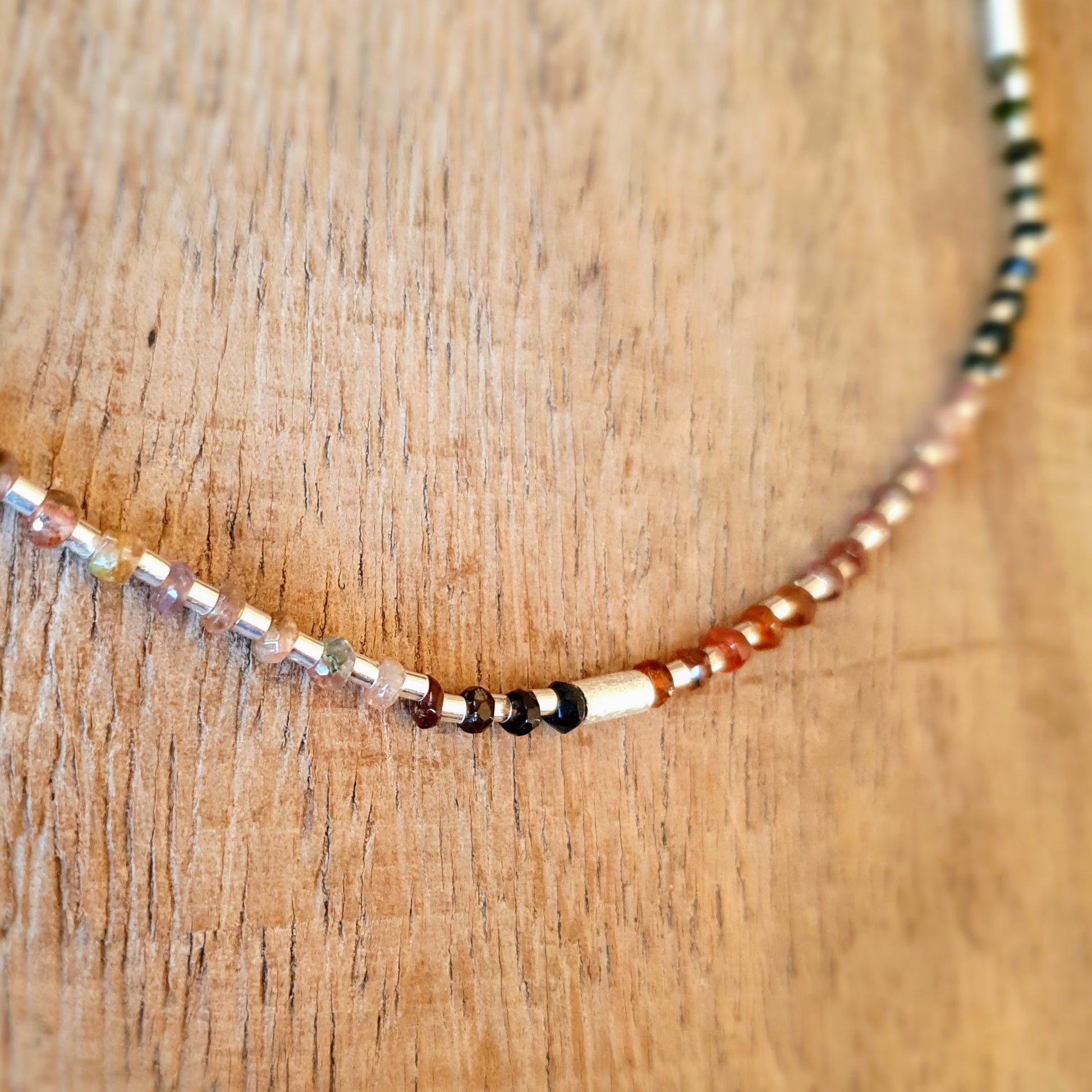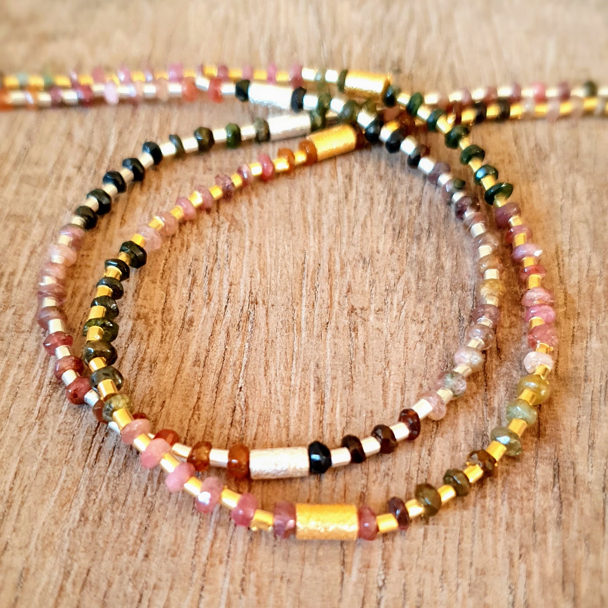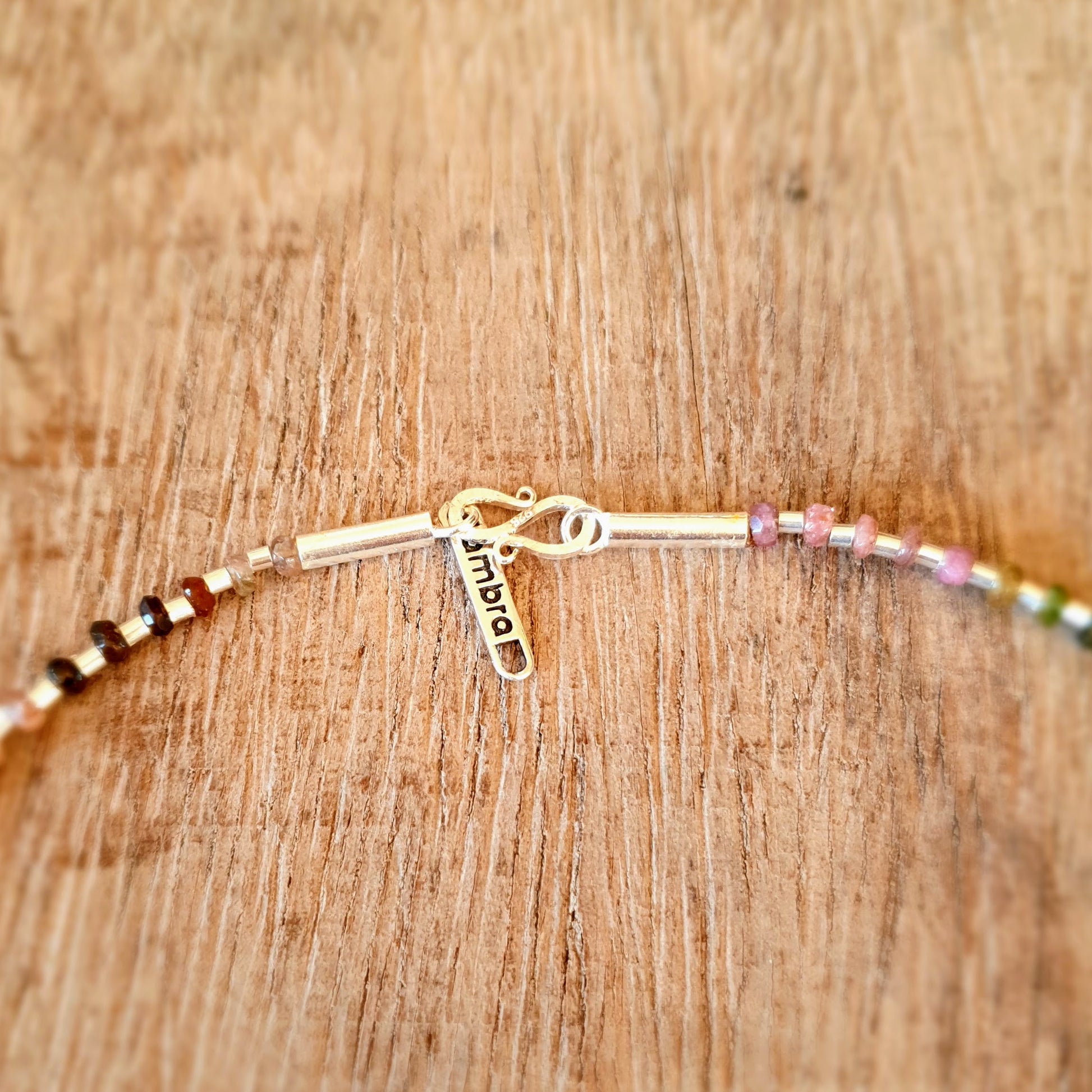 Feine handgearbeitete Halskette mit verschiedenfarbigen facettierten Turmalinsteinen zwischen mattierten Silberperlen mit Silberverschluss von ambra Schmuck.