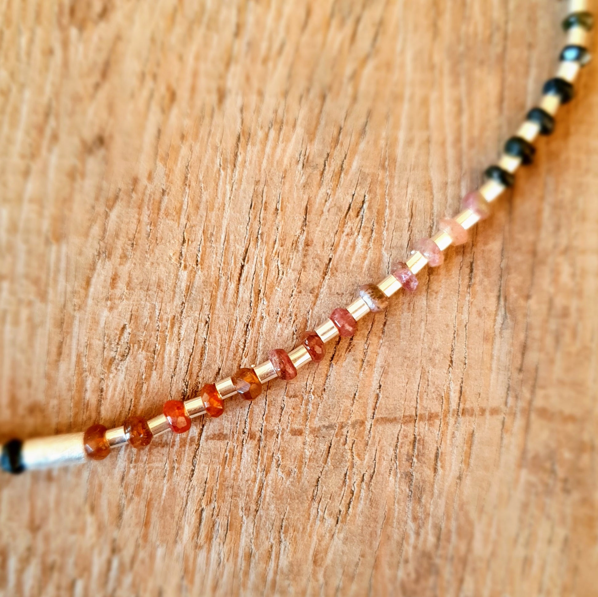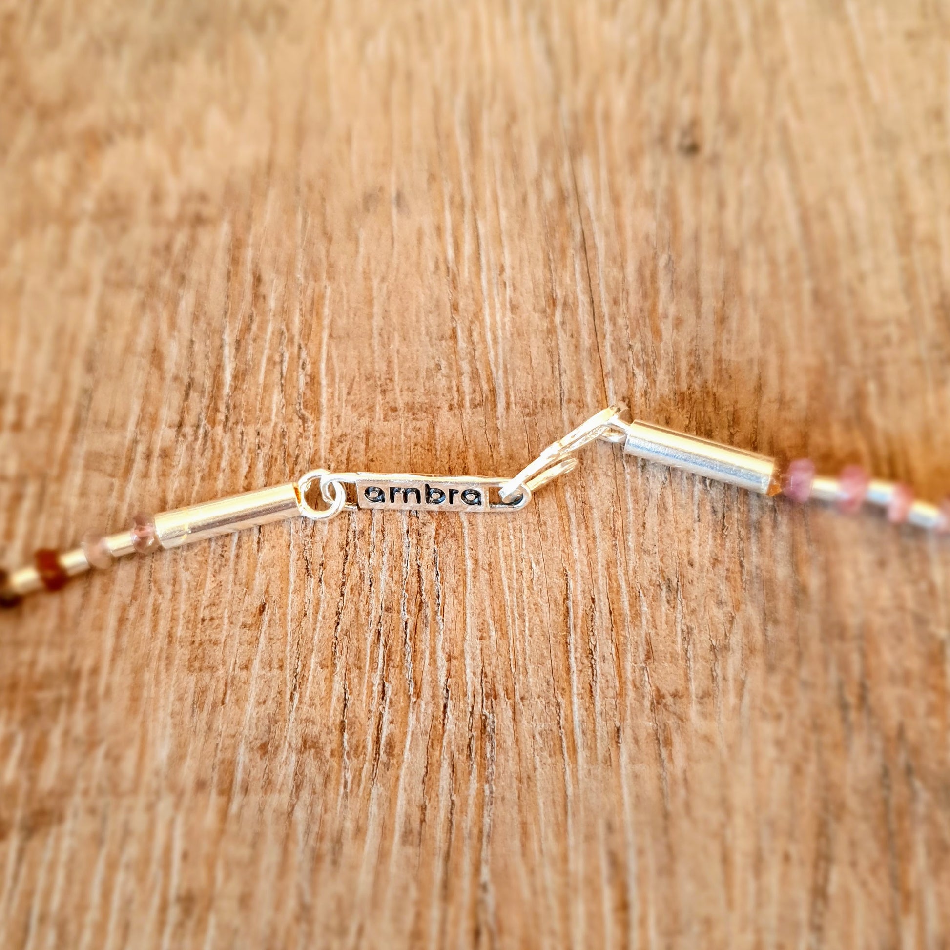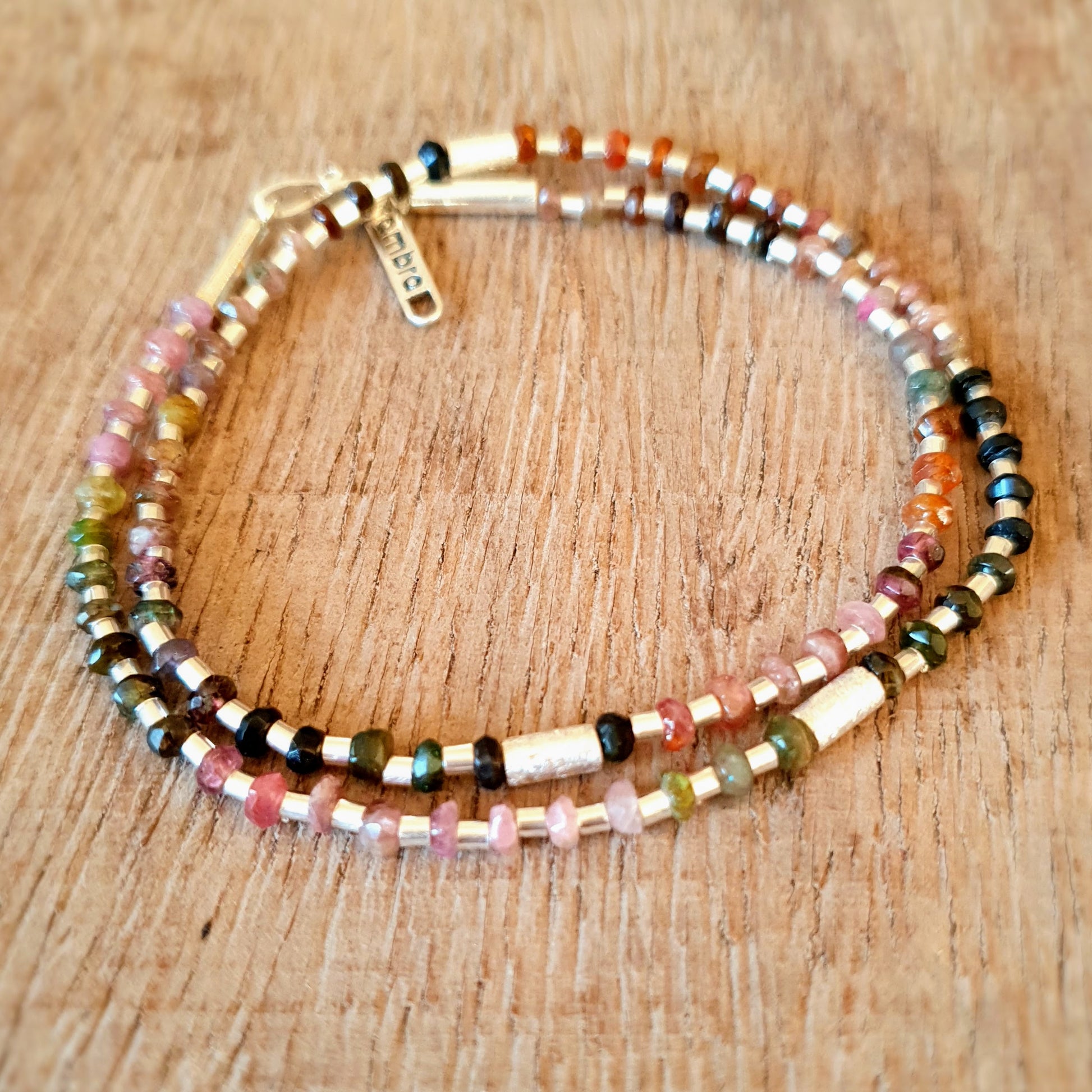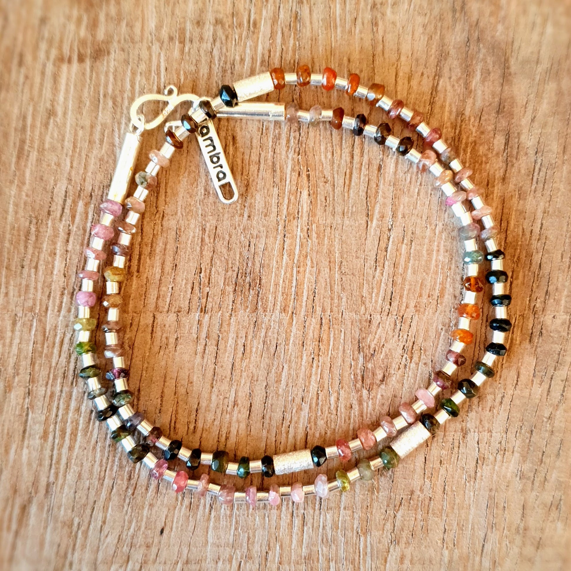 Feine handgearbeitete Halskette mit verschiedenfarbigen facettierten Turmalinsteinen zwischen mattierten Silberperlen mit Silberverschluss von ambra Schmuck.