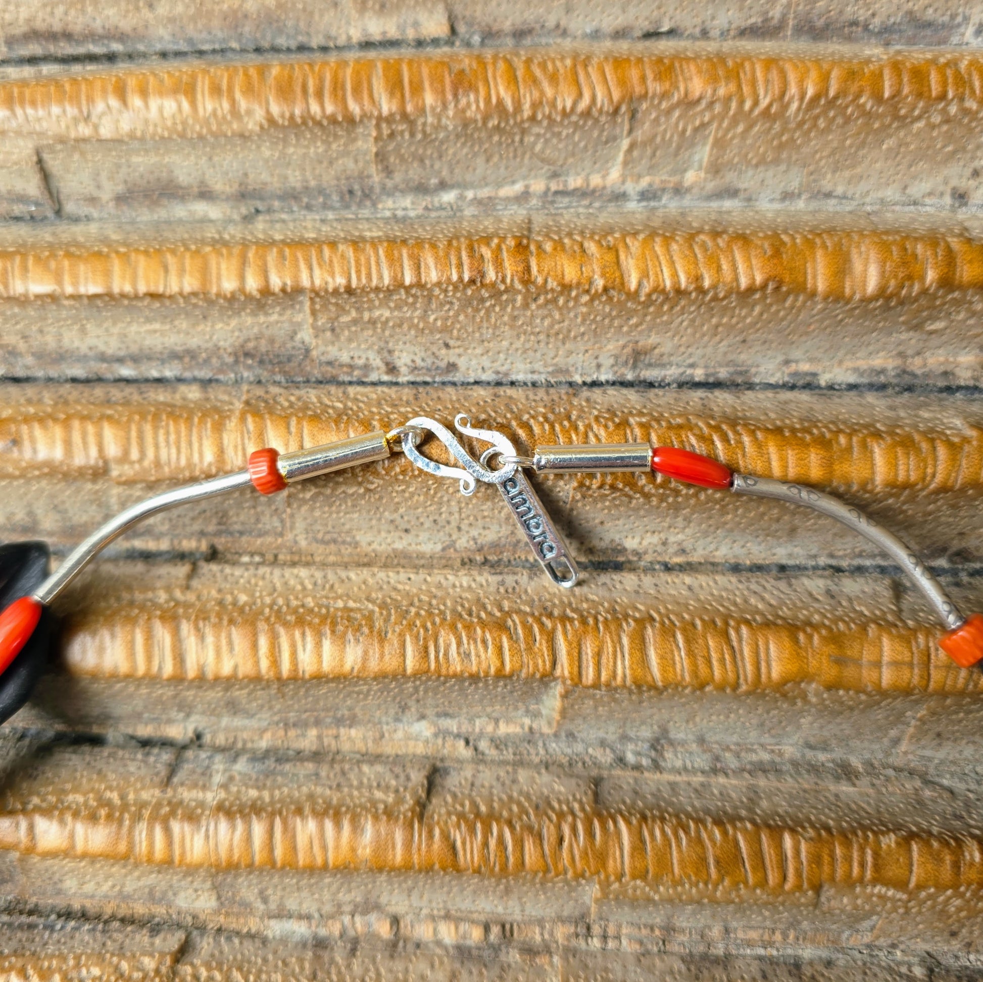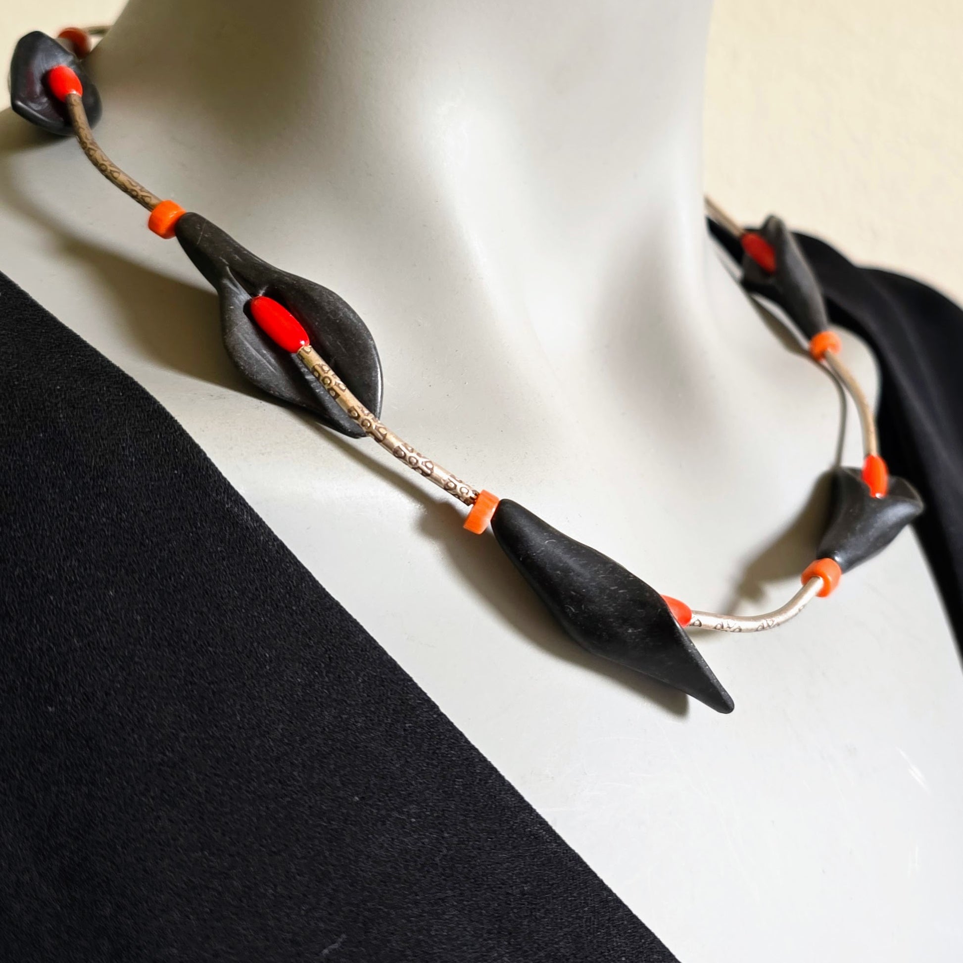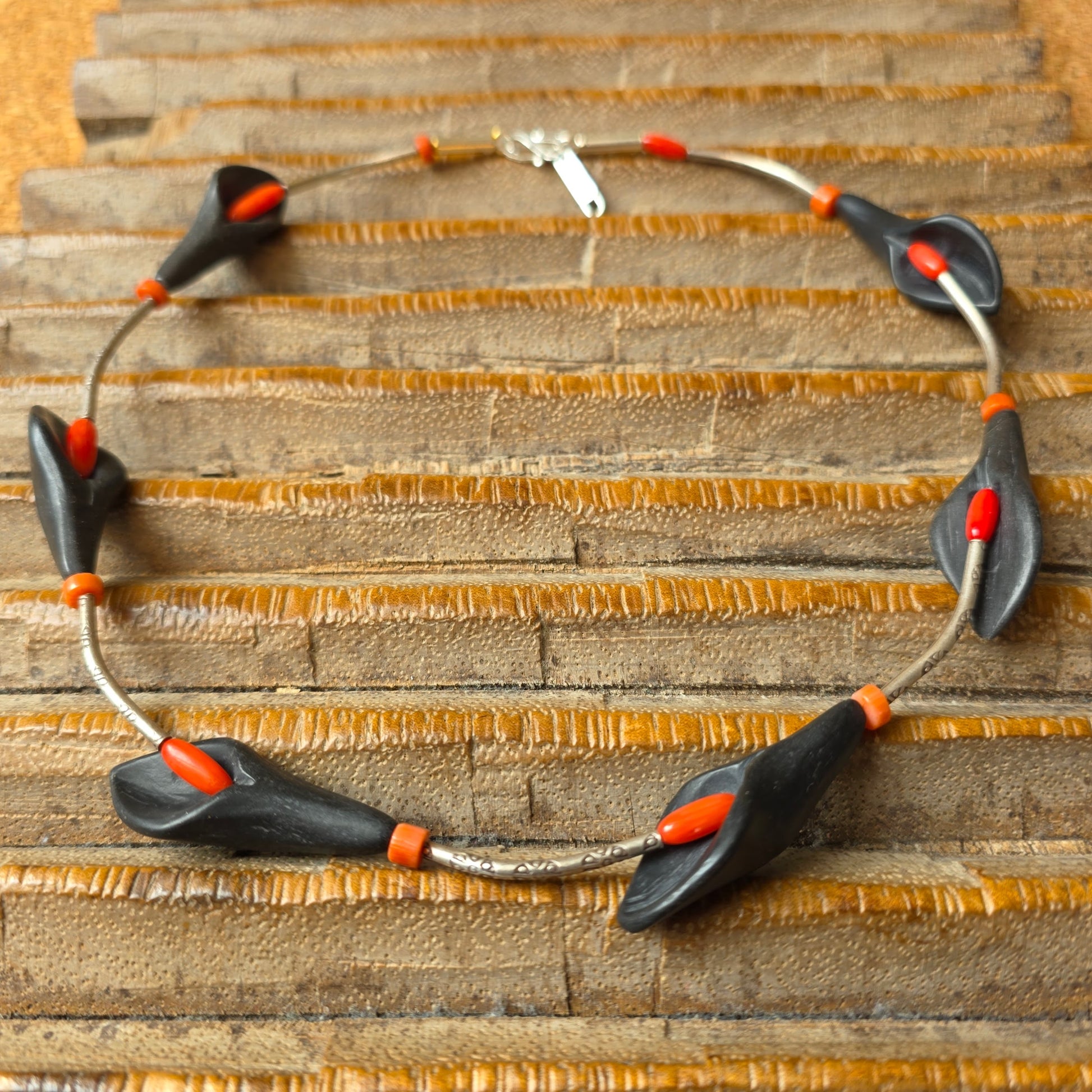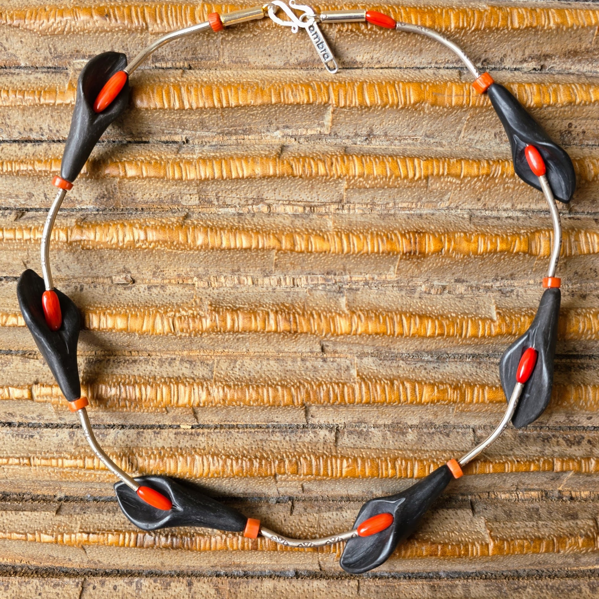 Florale handgearbeitete Halskette mit schwarzen Onyxsteinen in Blütenform, roten Korallenperlen und gehämmerten Röhrchen aus burmesischem Silber mit Silberverschluss von ambra Schmuck.