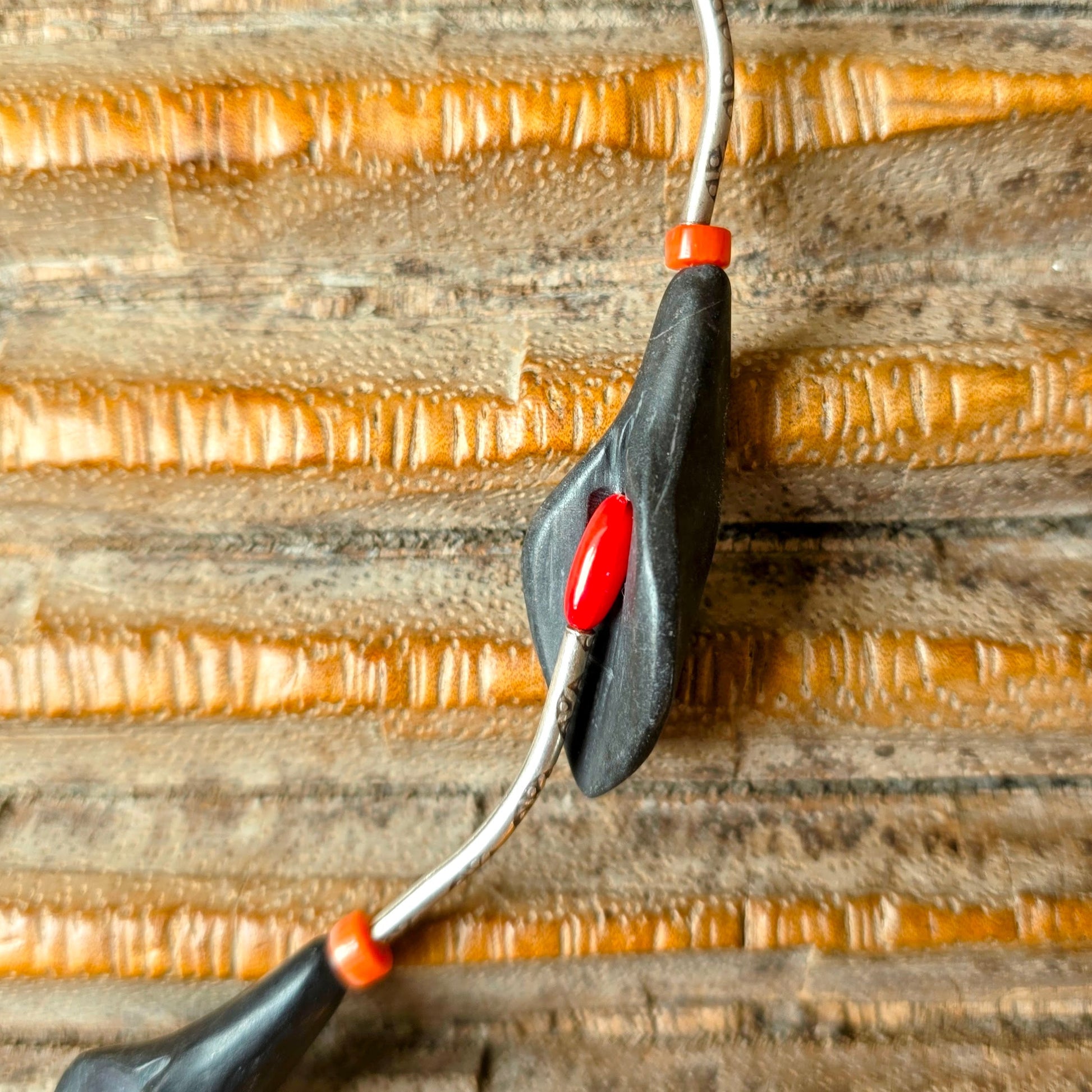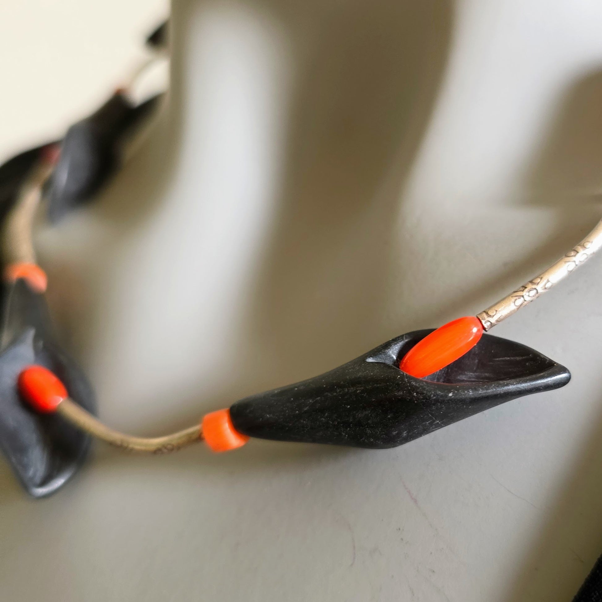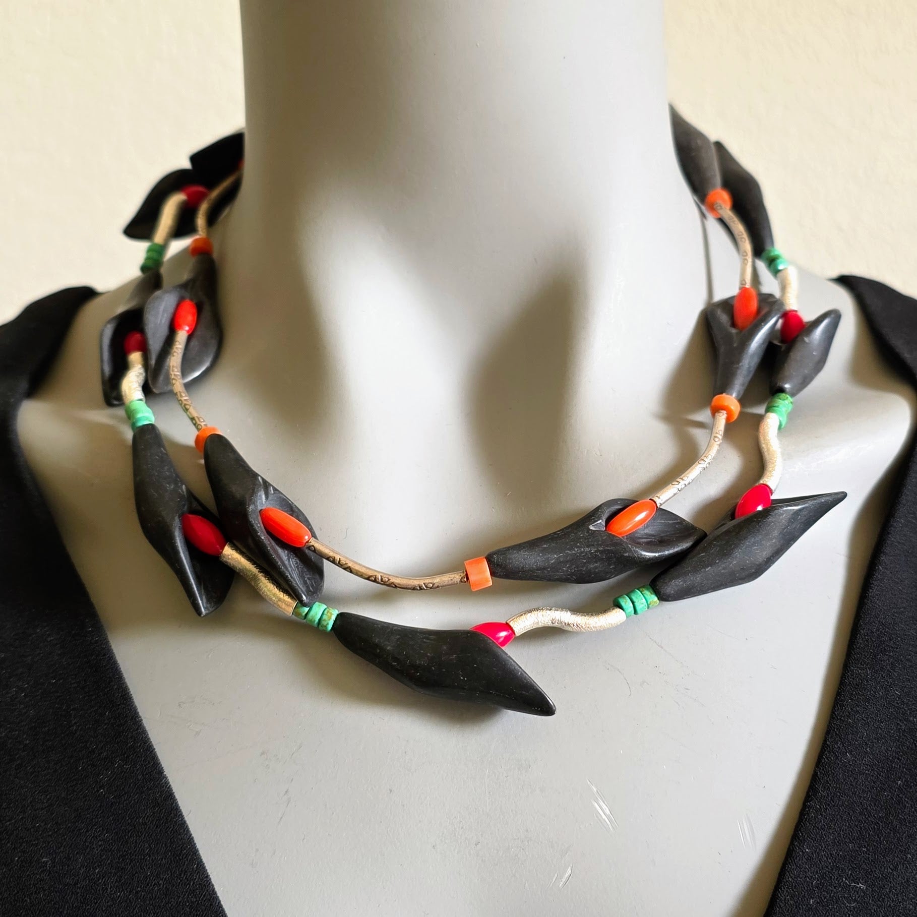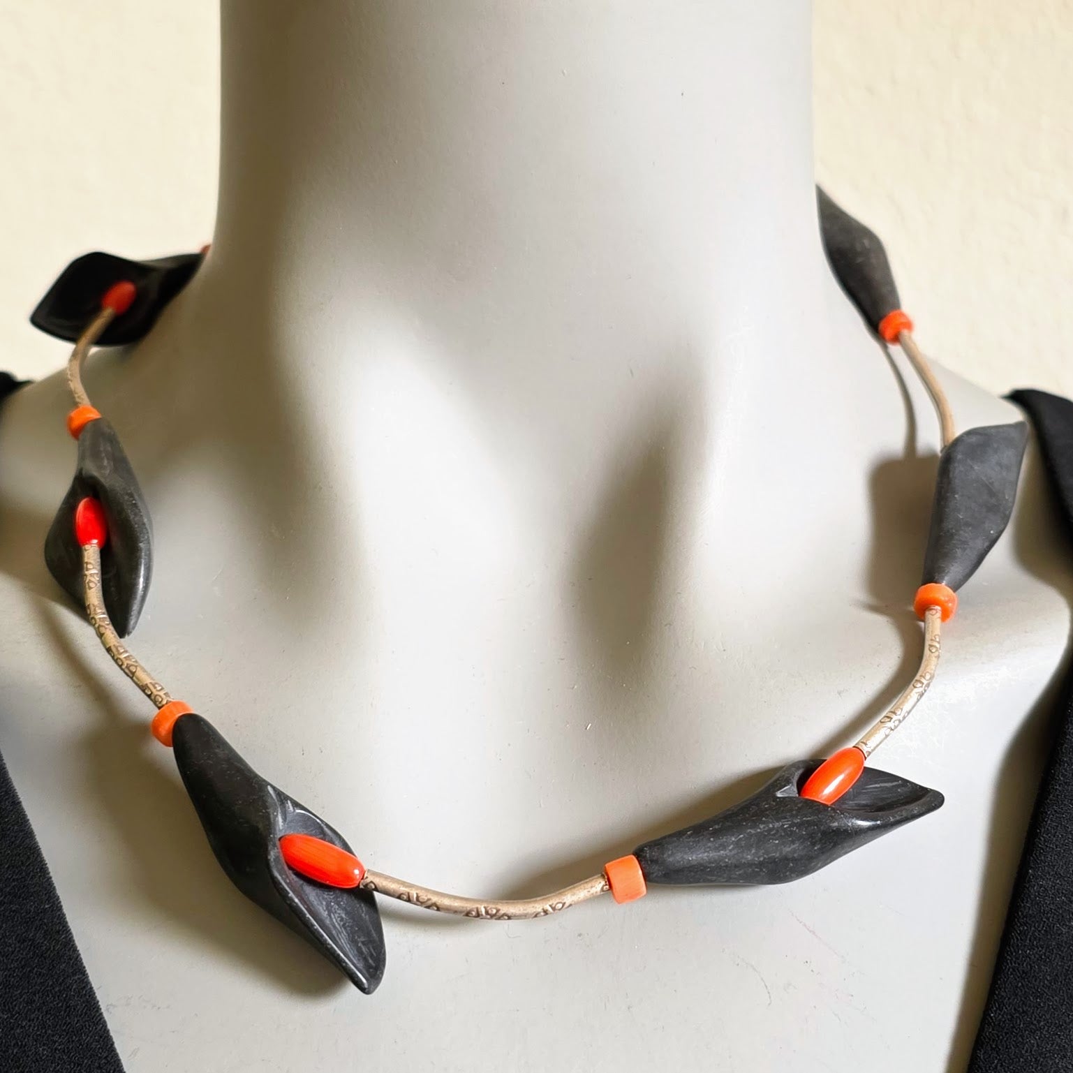 Florale handgearbeitete Halskette mit schwarzen Onyxsteinen in Blütenform, roten Korallenperlen und gehämmerten Röhrchen aus burmesischem Silber mit Silberverschluss von ambra Schmuck.