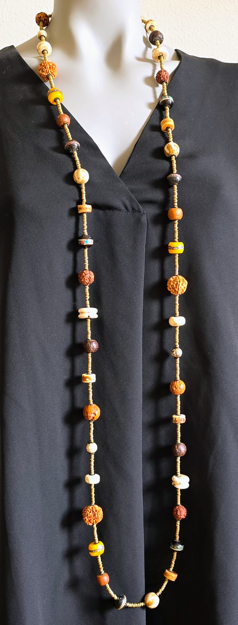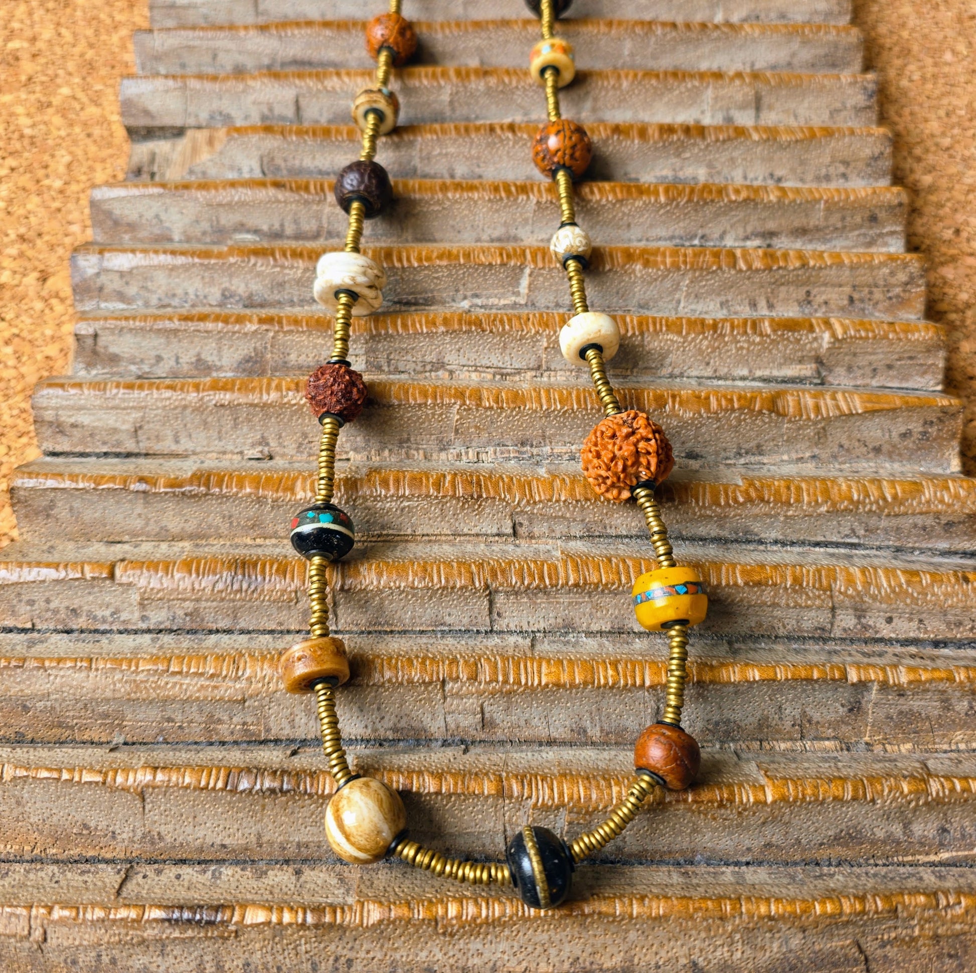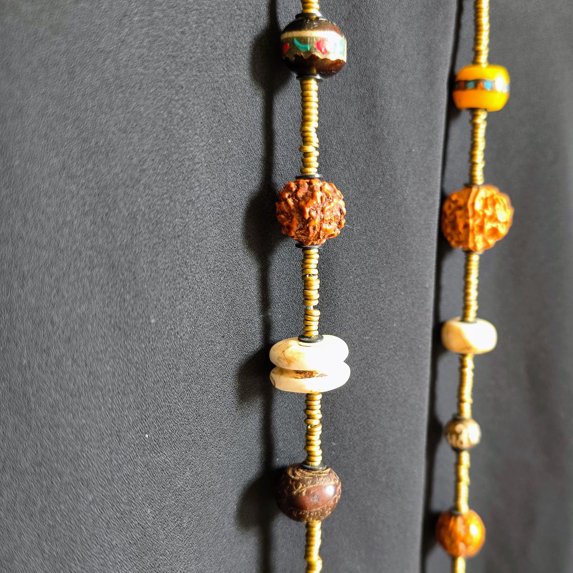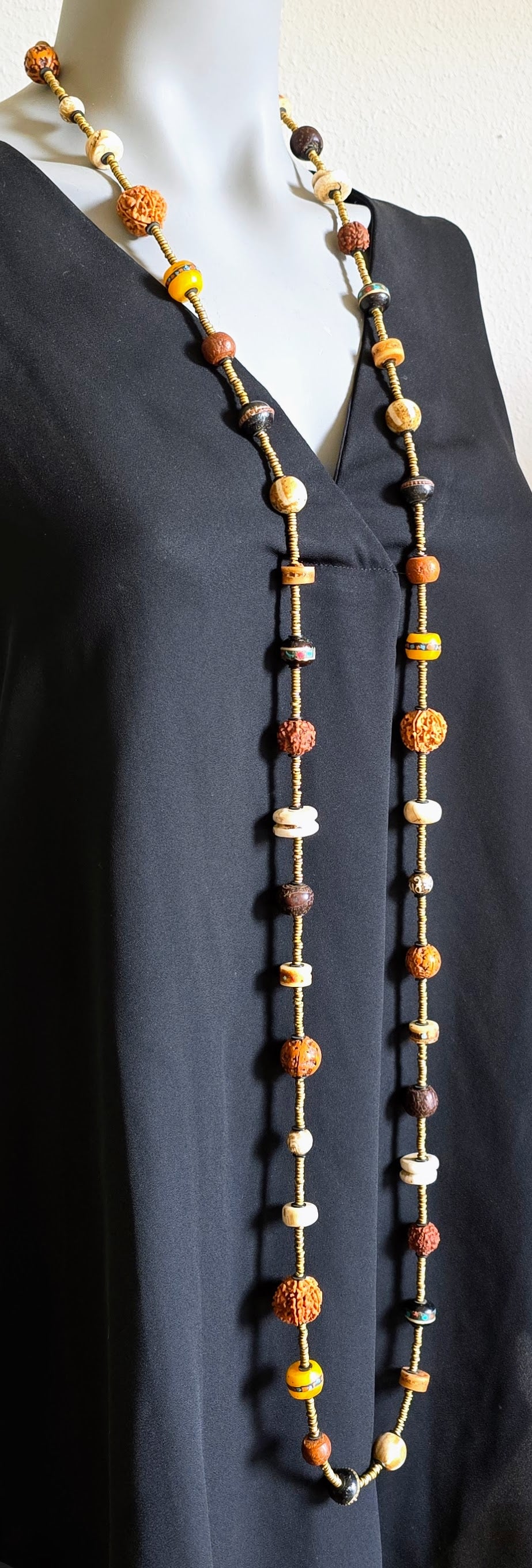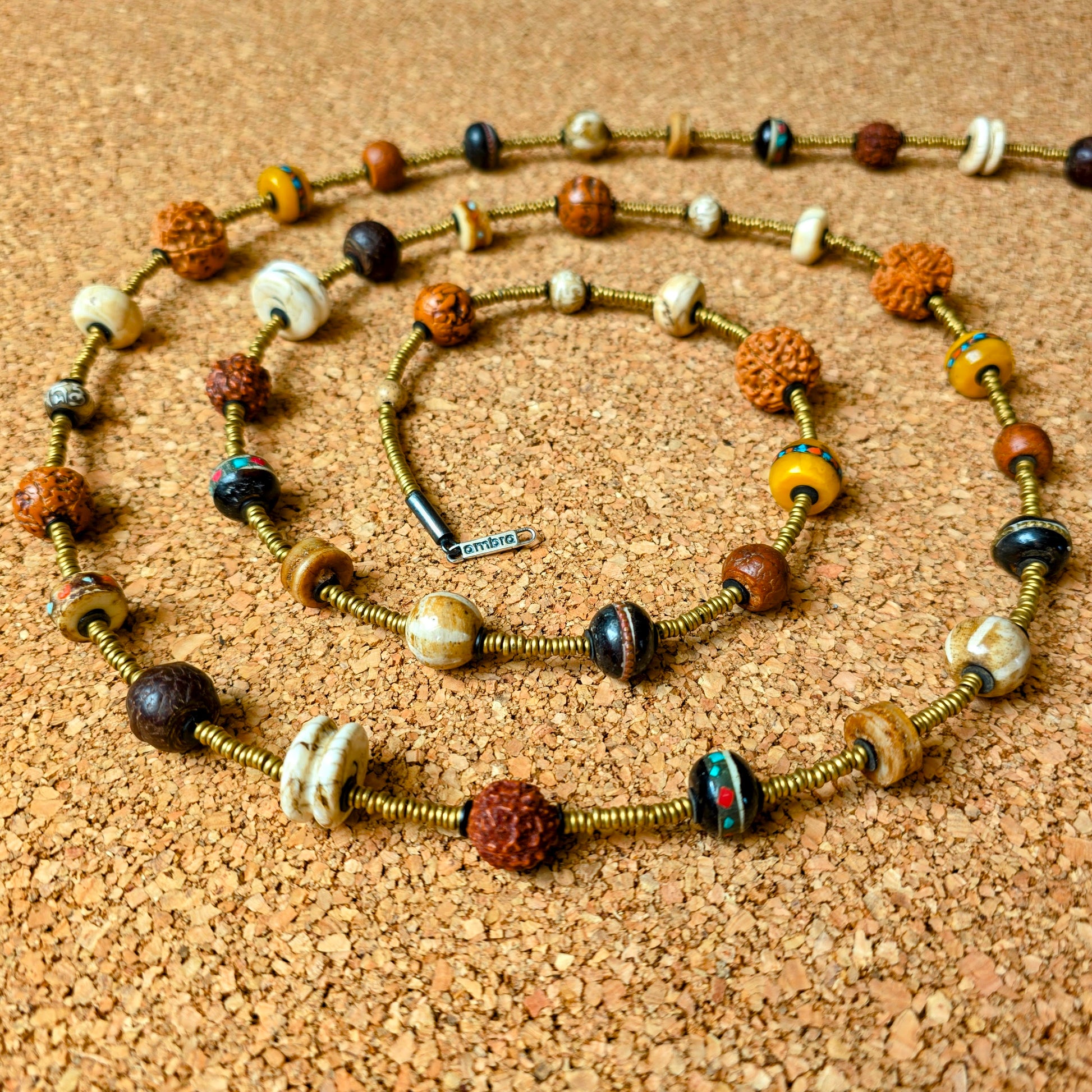 Lange handgearbeitete Halskette mit Bronzeperlen und Rudrakshasamen, Muscheln, Harz- und Beinperlen aus nepalesischen Gebets-Malas mit oxidiertem Silberverschluss von ambra Schmuck.