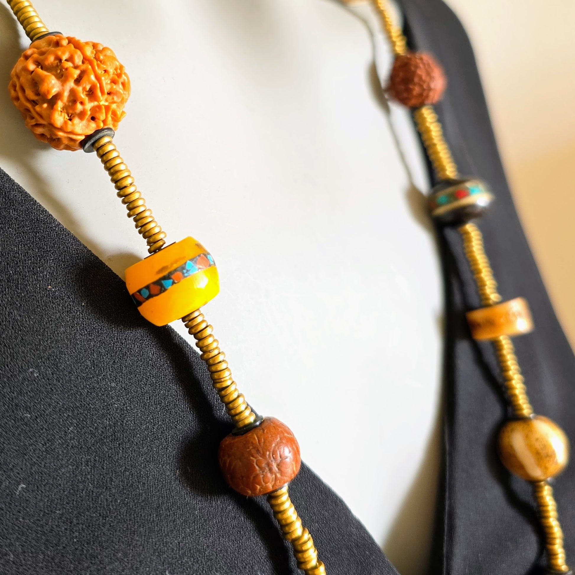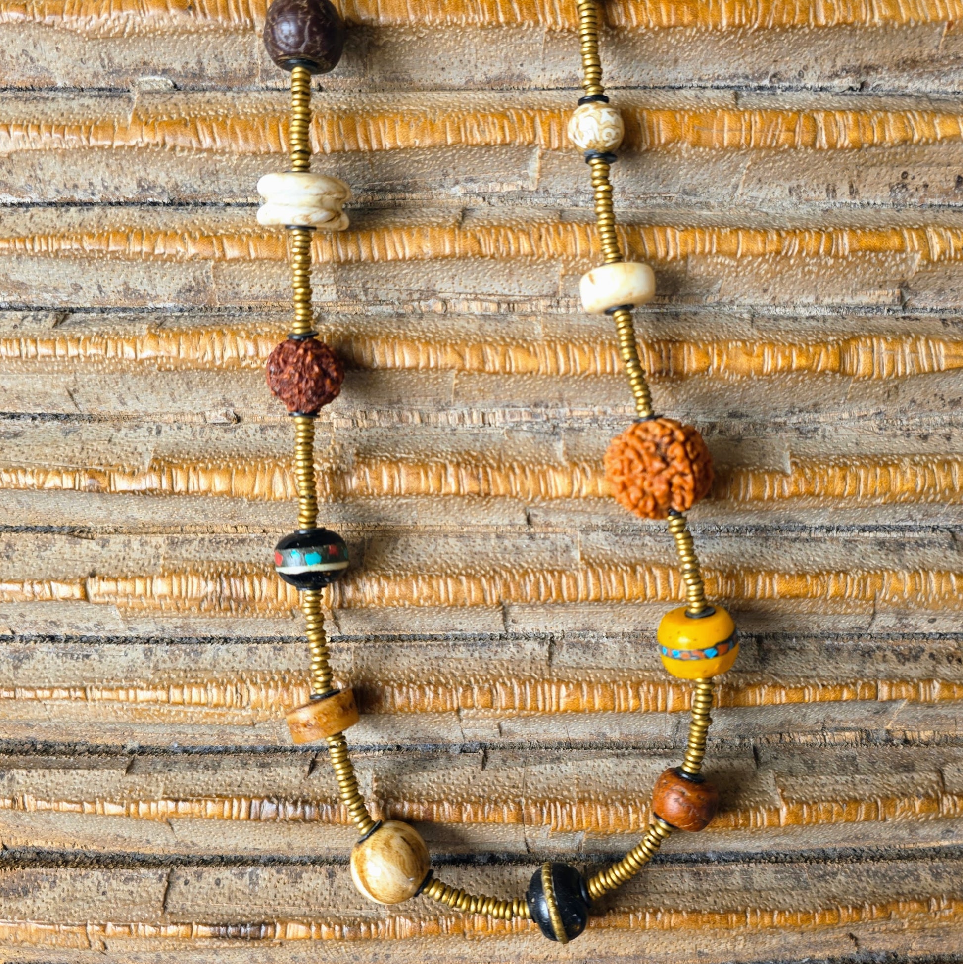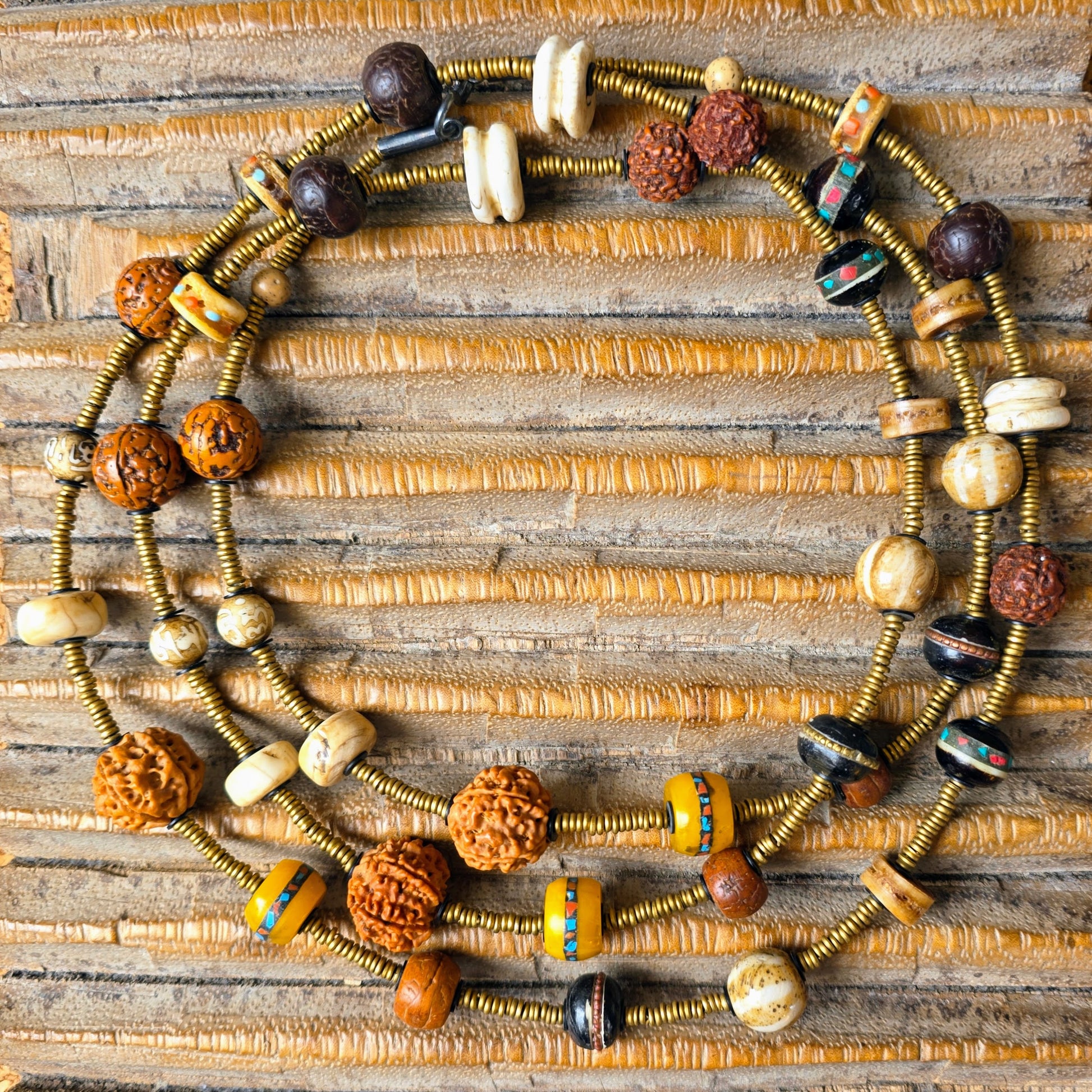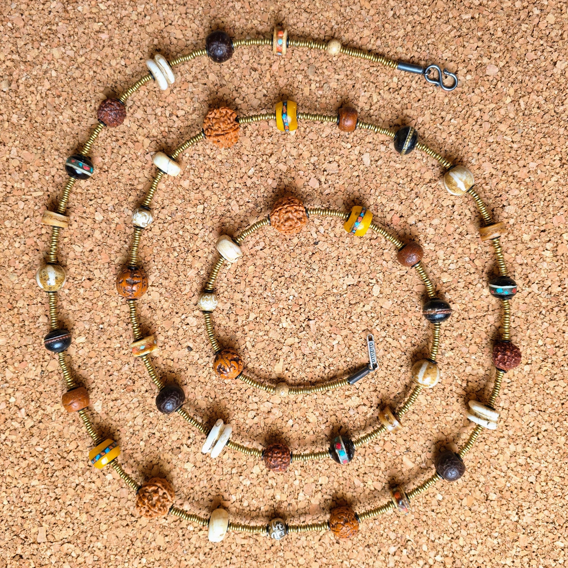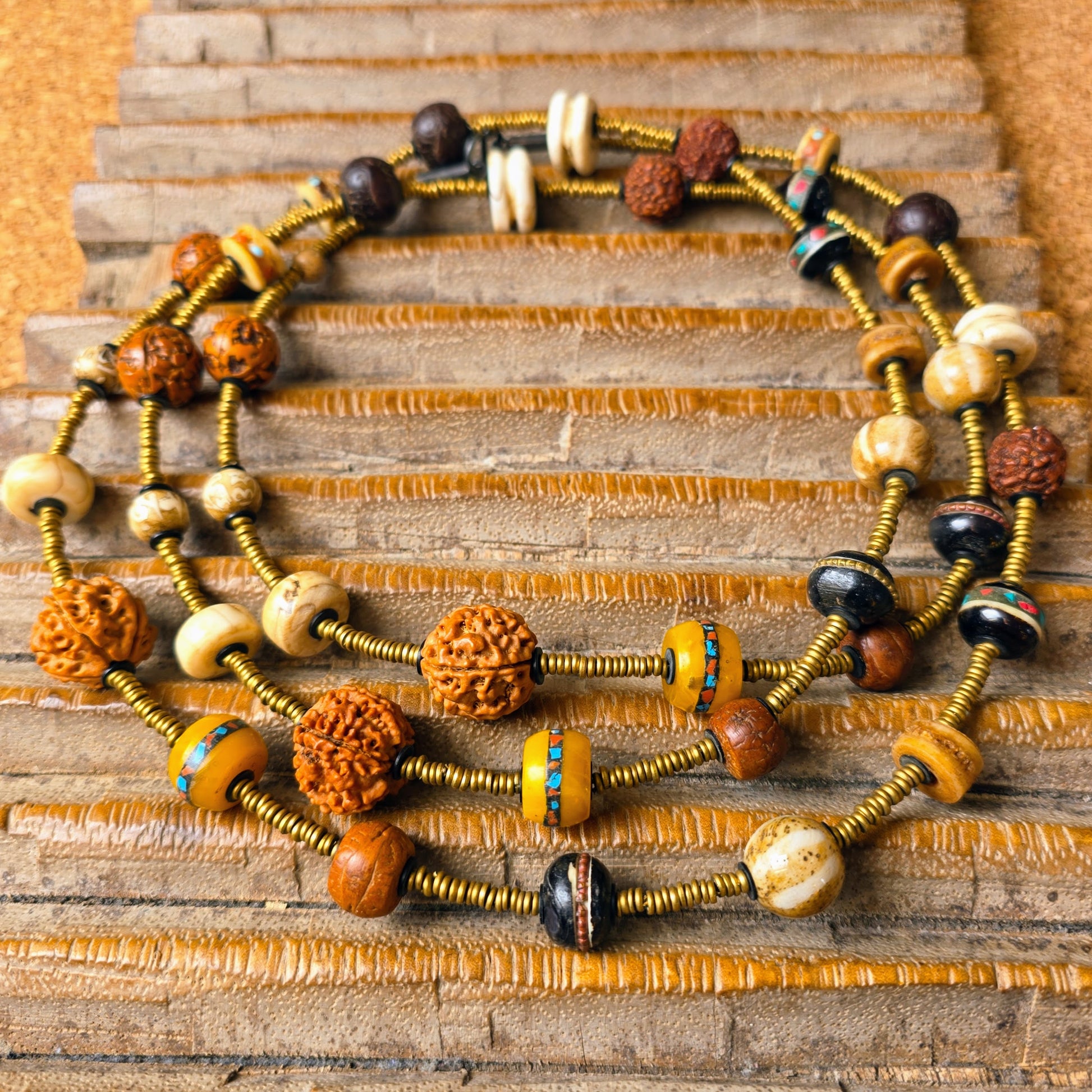 Lange handgearbeitete Halskette mit Bronzeperlen und Rudrakshasamen, Muscheln, Harz- und Beinperlen aus nepalesischen Gebets-Malas mit oxidiertem Silberverschluss von ambra Schmuck.