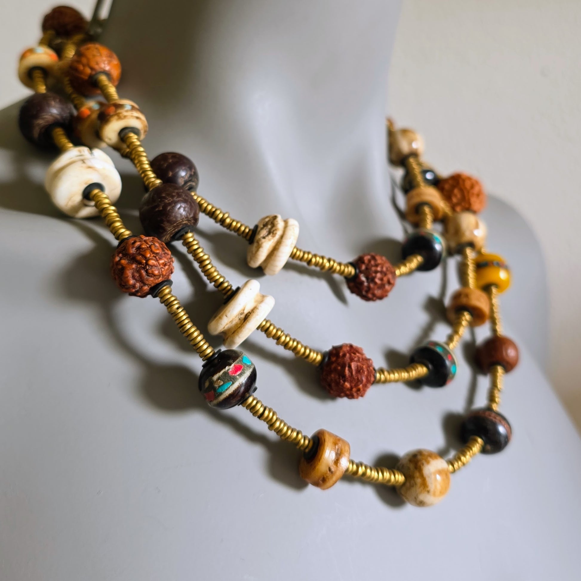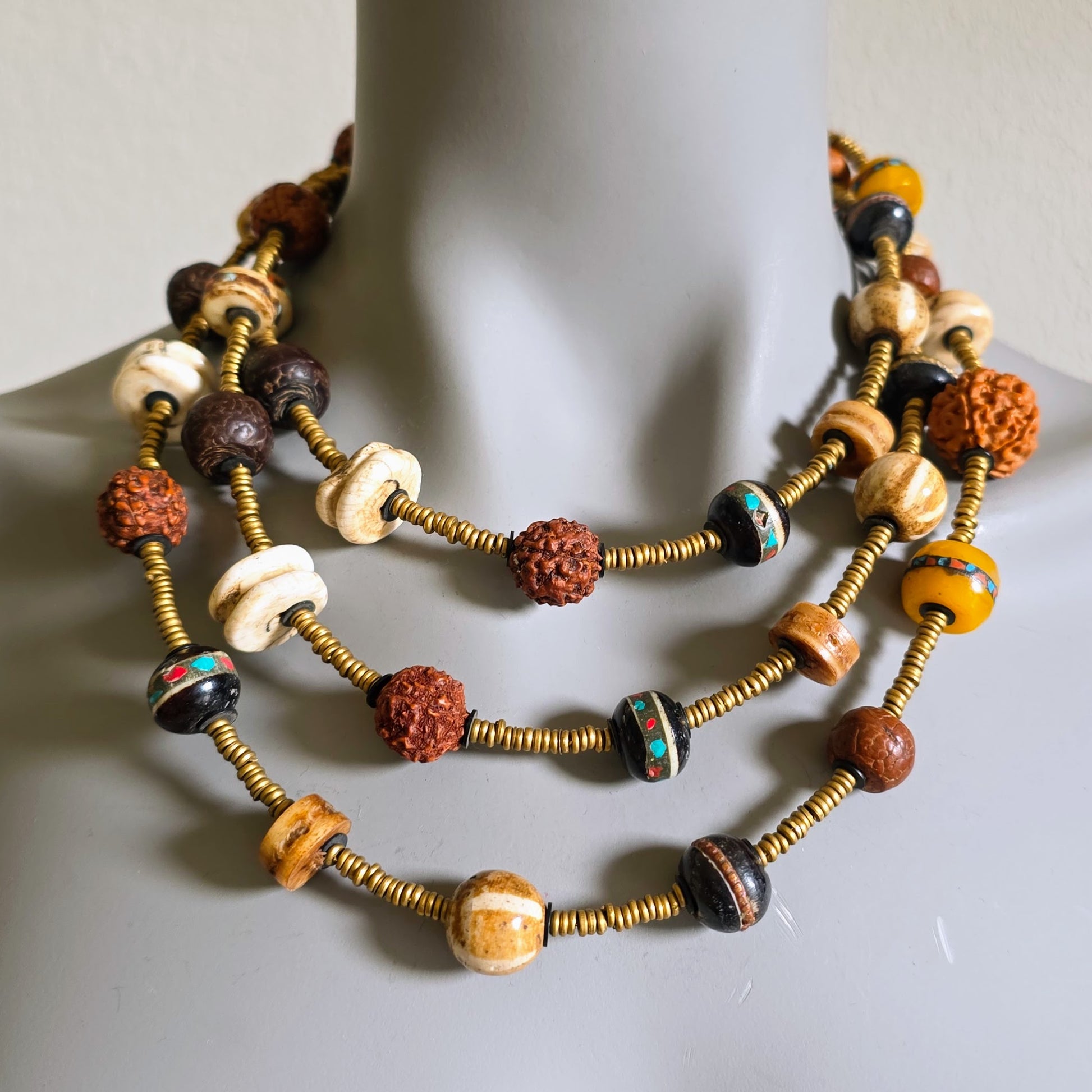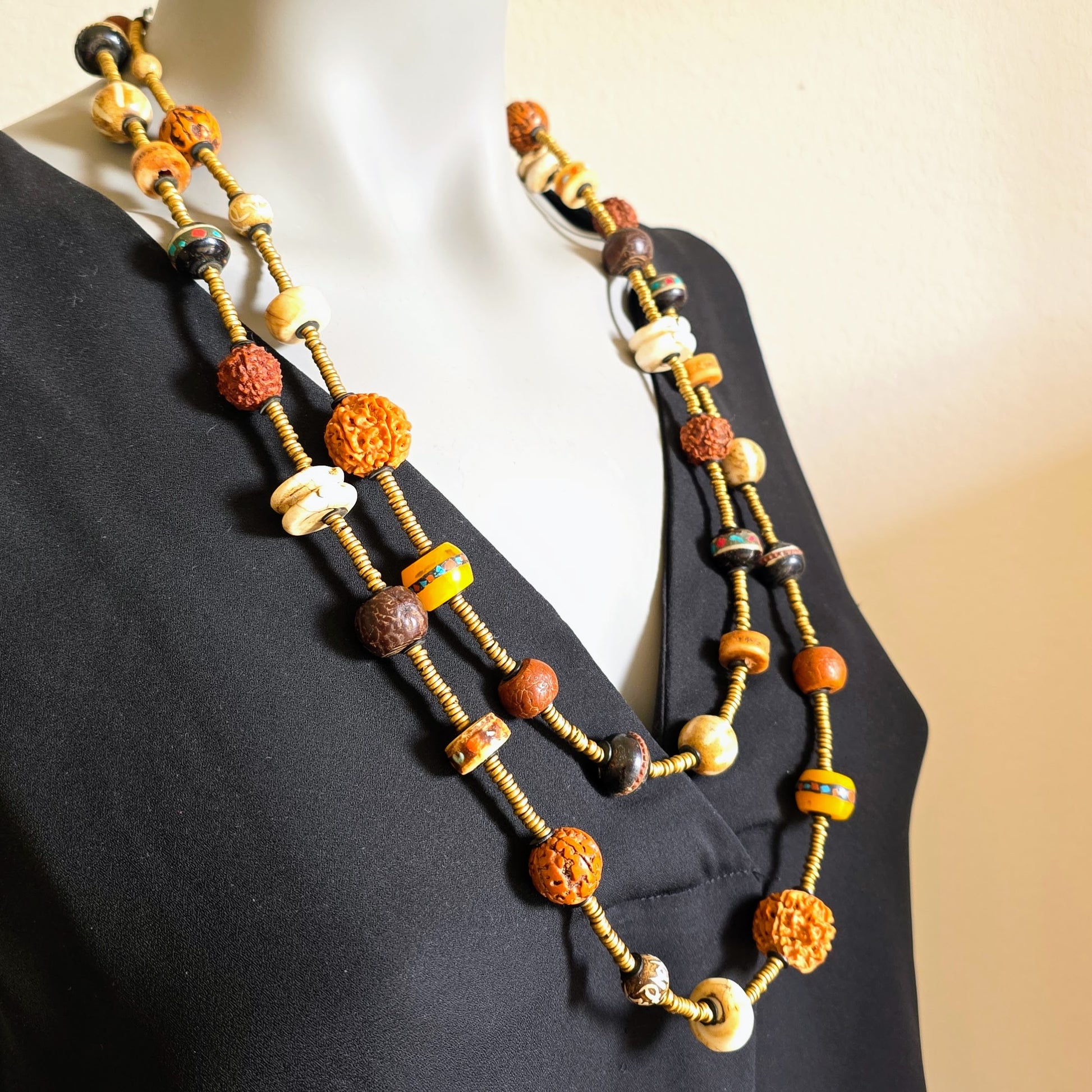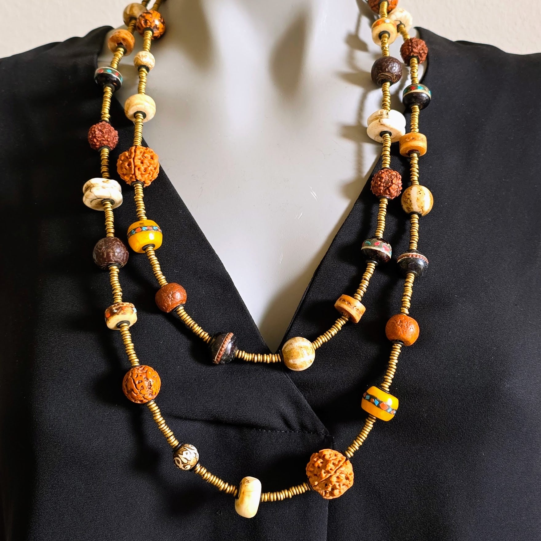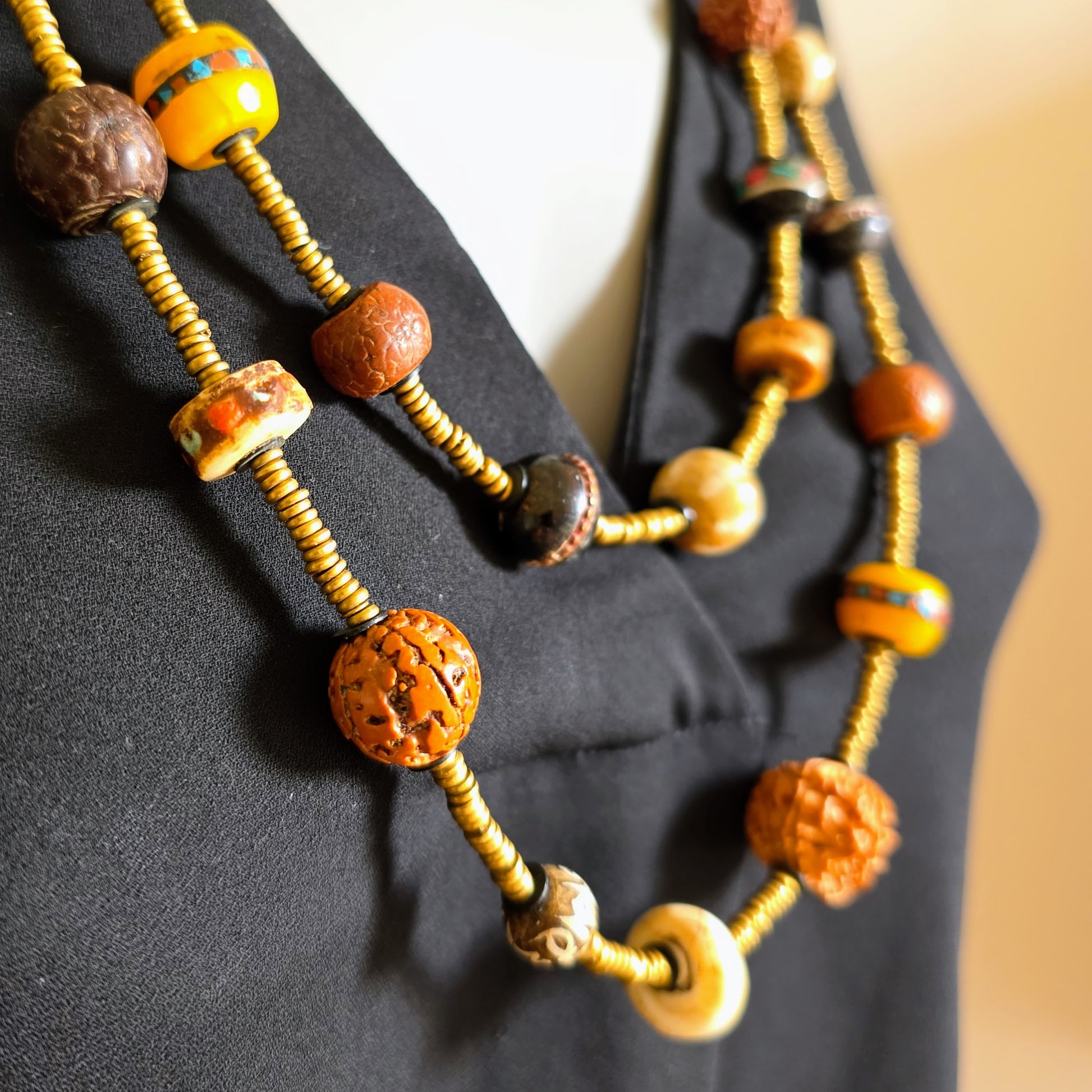 Lange handgearbeitete Halskette mit Bronzeperlen und Rudrakshasamen, Muscheln, Harz- und Beinperlen aus nepalesischen Gebets-Malas mit oxidiertem Silberverschluss von ambra Schmuck.