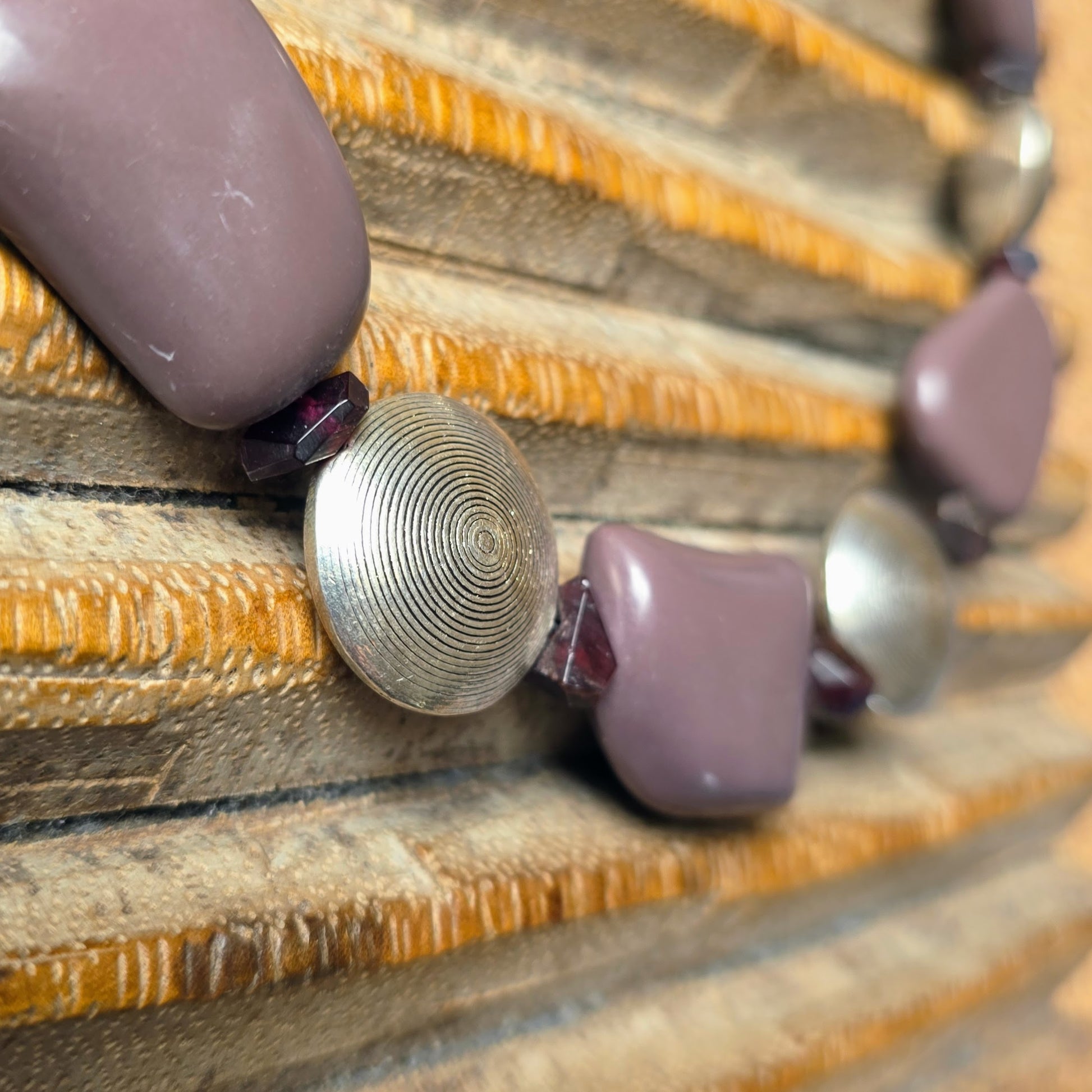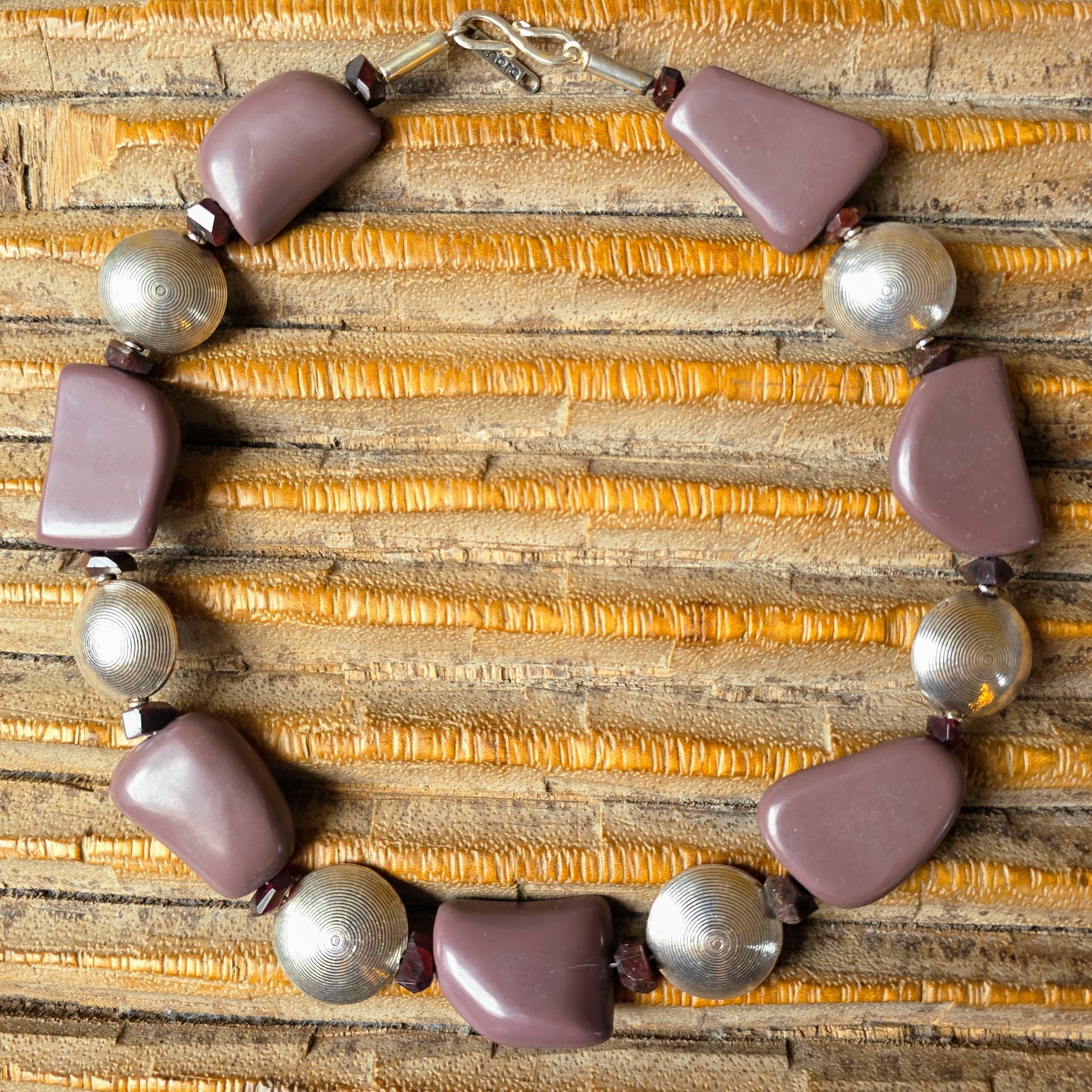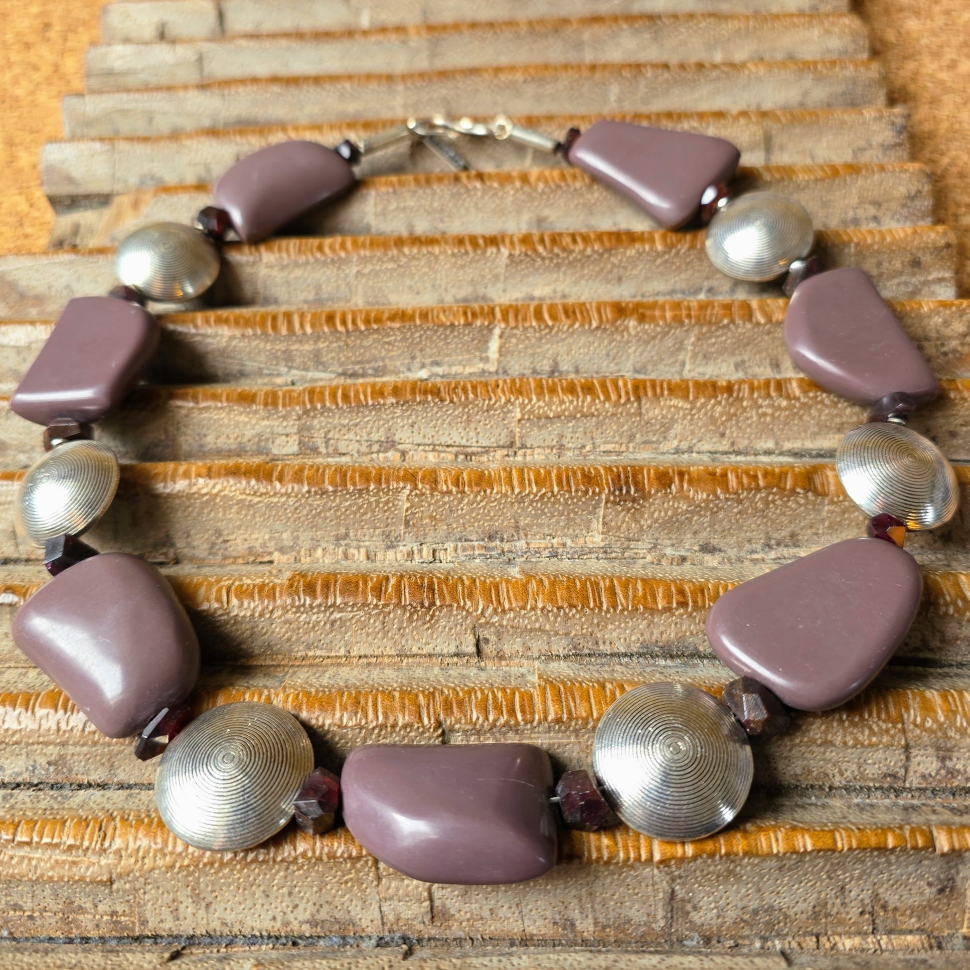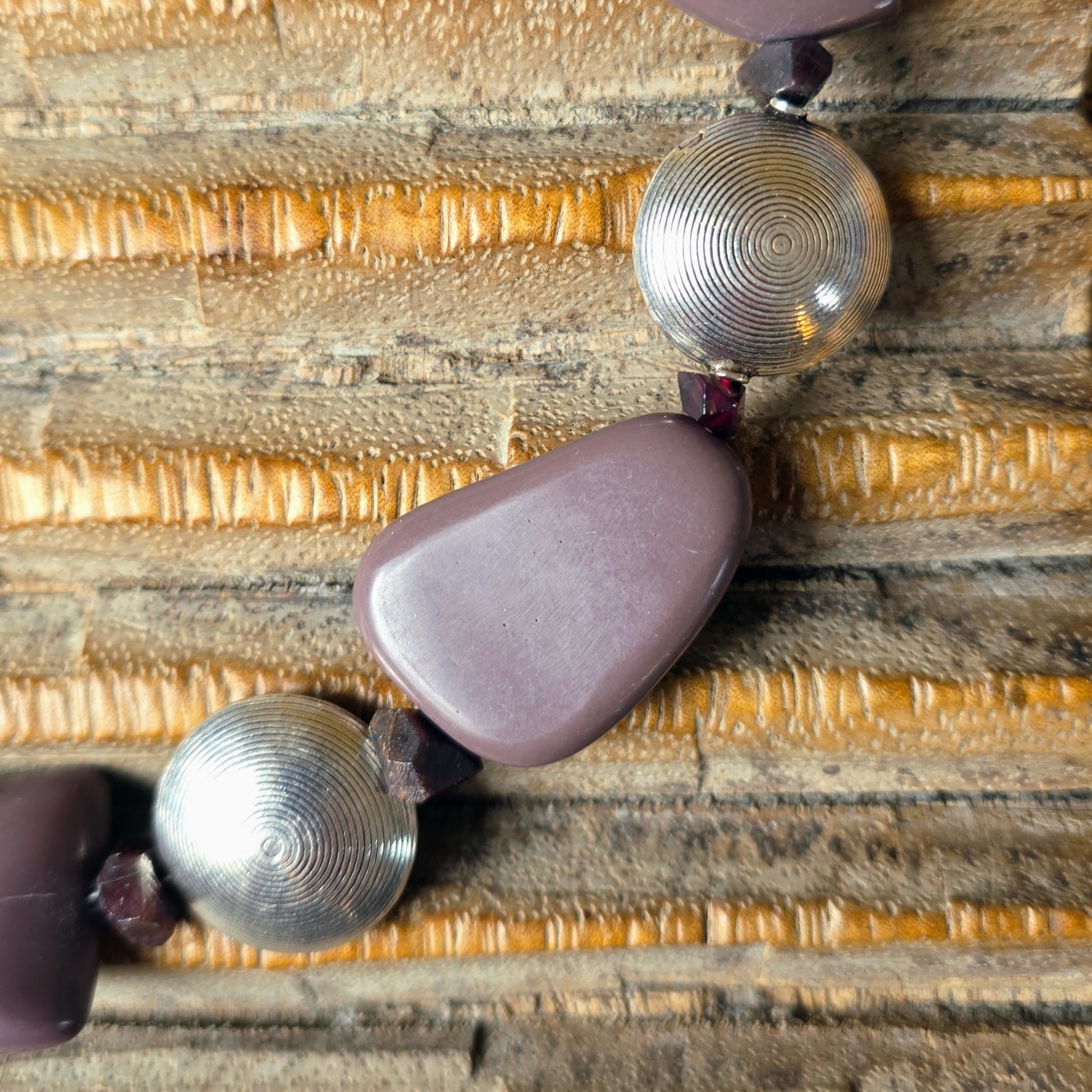 Handgearbeitete Halskette mit lilafarbenen Harz-Stein-Perlen, unregelmäßig geschliffenen Granatsteinen und Silber-Spiralenperlen aus Bali mit Silberverschluss von ambra Schmuck.