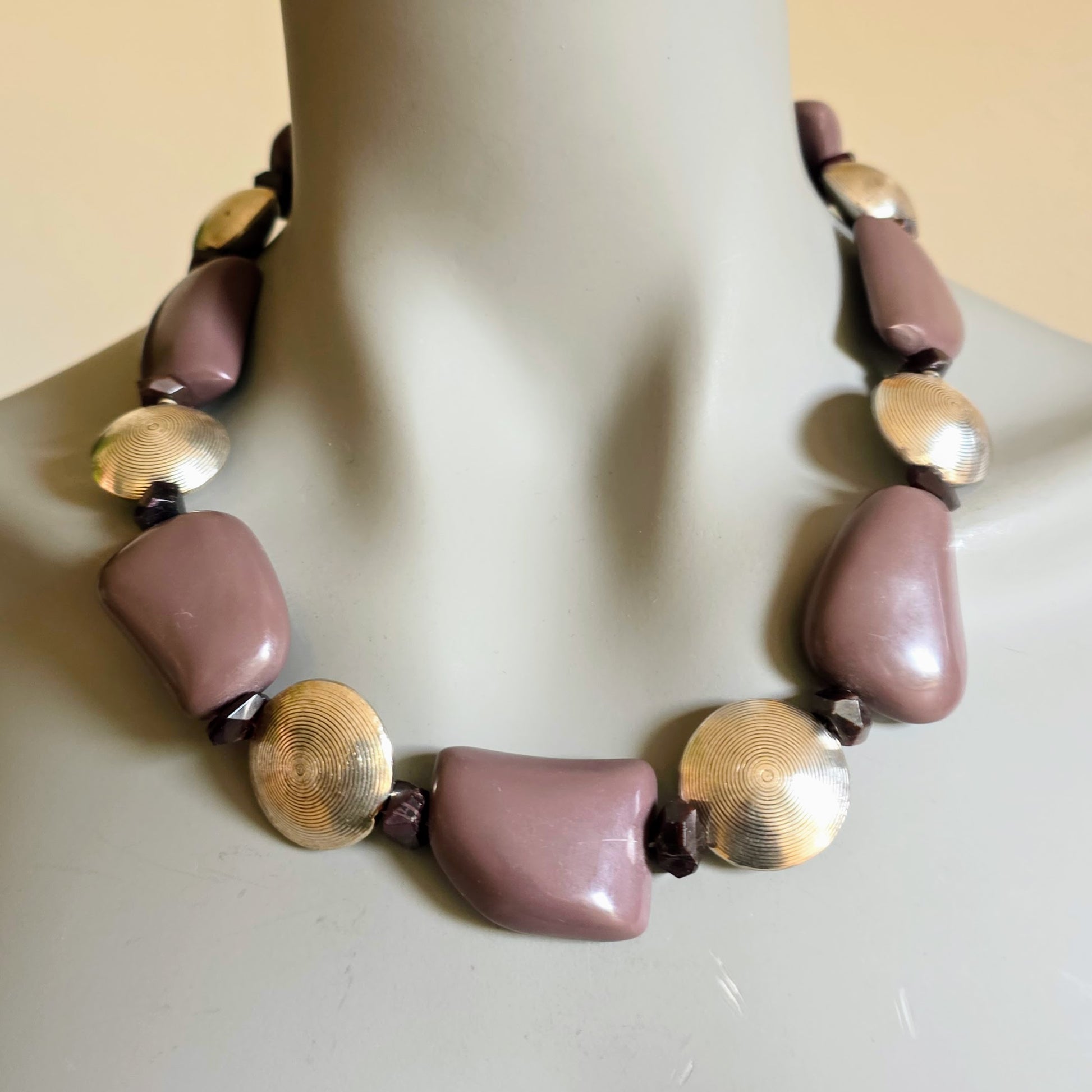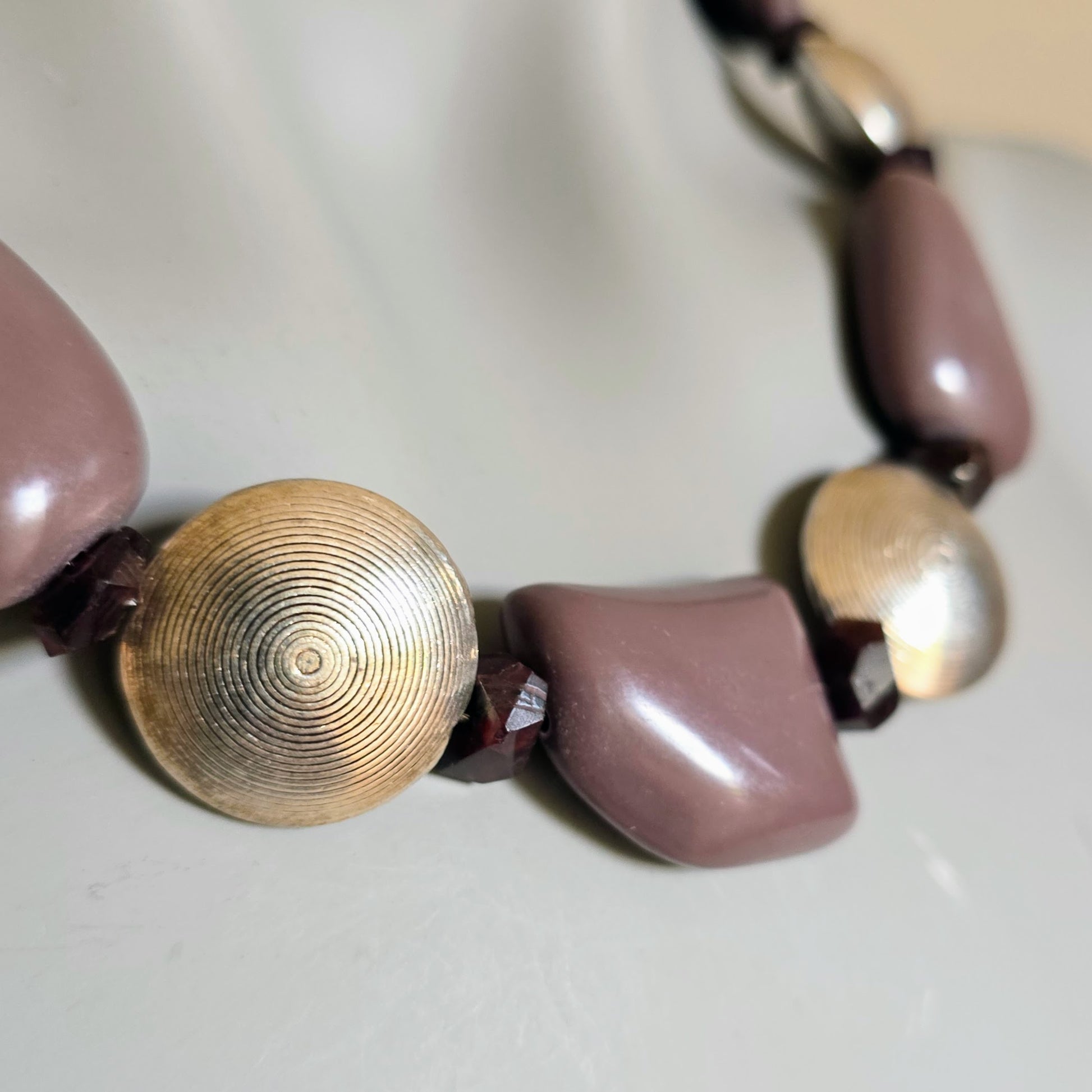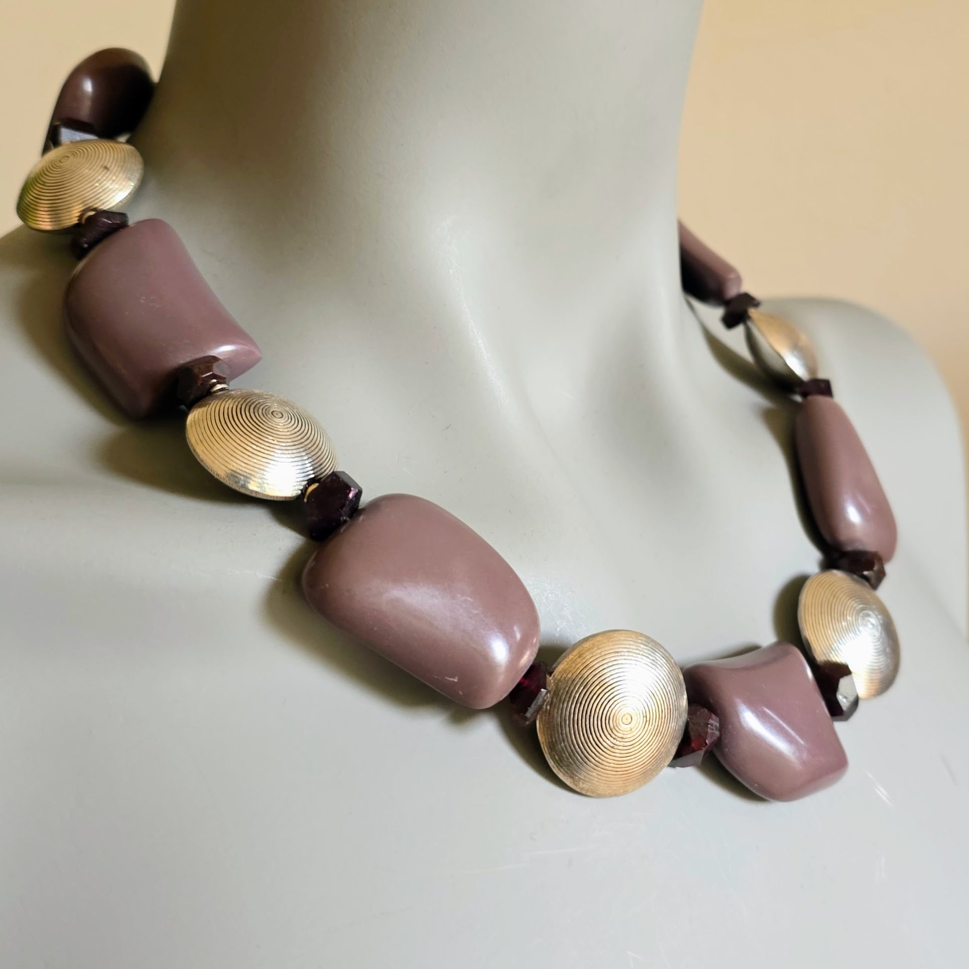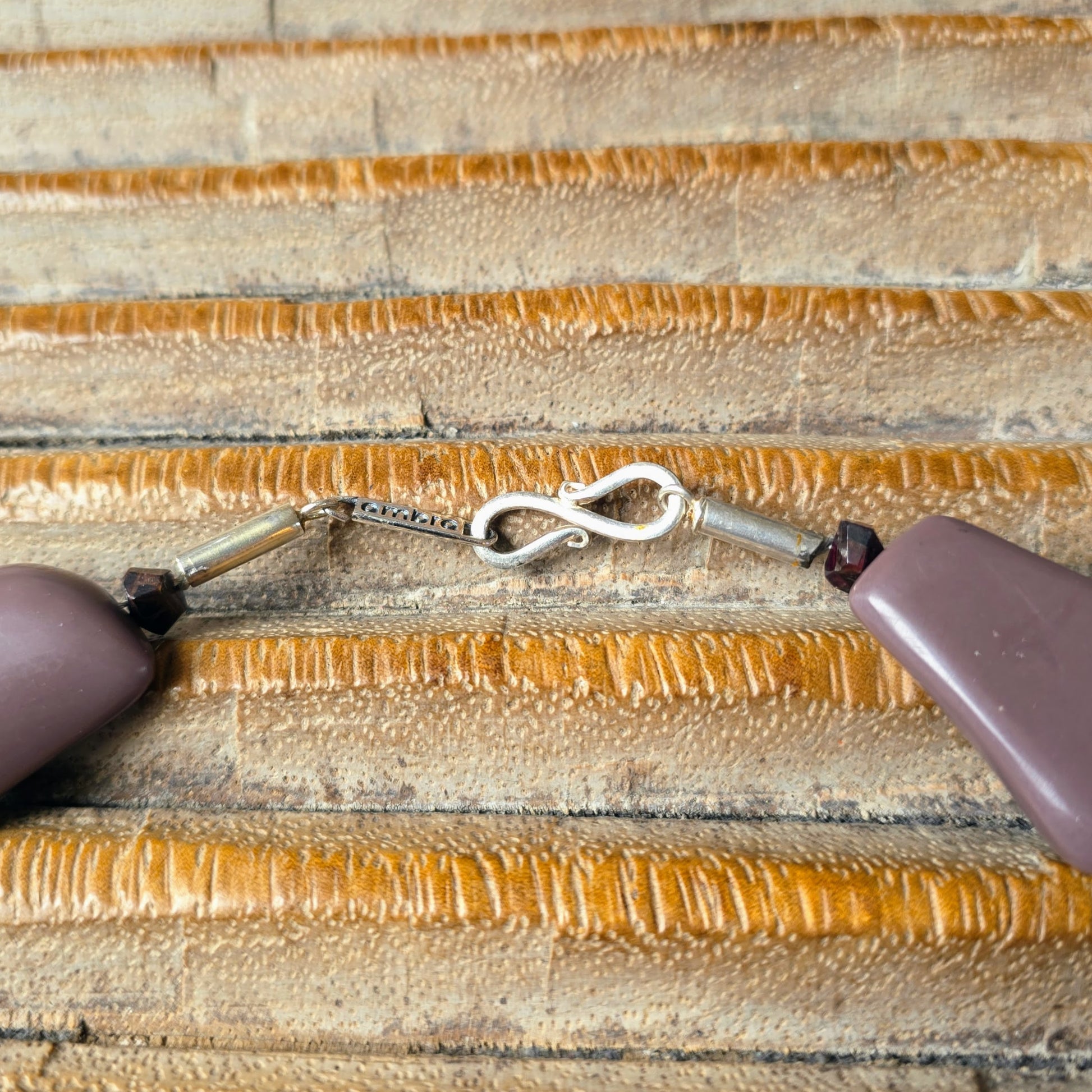 Handgearbeitete Halskette mit lilafarbenen Harz-Stein-Perlen, unregelmäßig geschliffenen Granatsteinen und Silber-Spiralenperlen aus Bali mit Silberverschluss von ambra Schmuck.